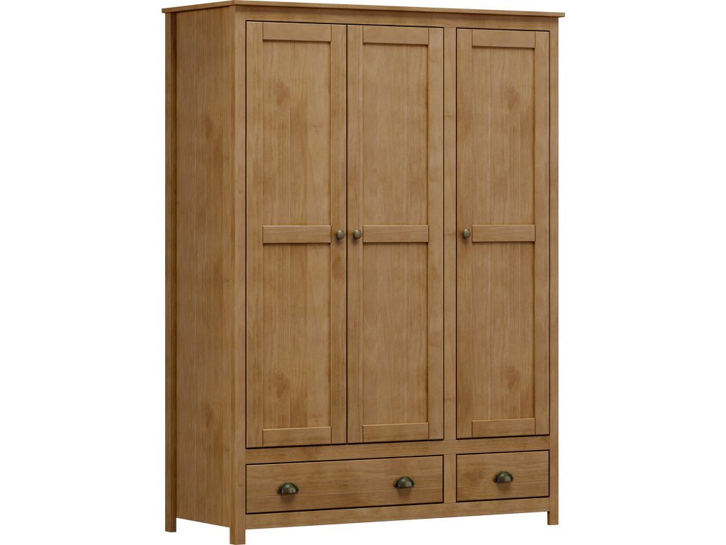 materiál masiv borovice, barevné provedení dub dvě zásuvky s kovovými úchytkami a pojezdy v levé části 3 police, v pravé části 1 police a kovová šatní tyč