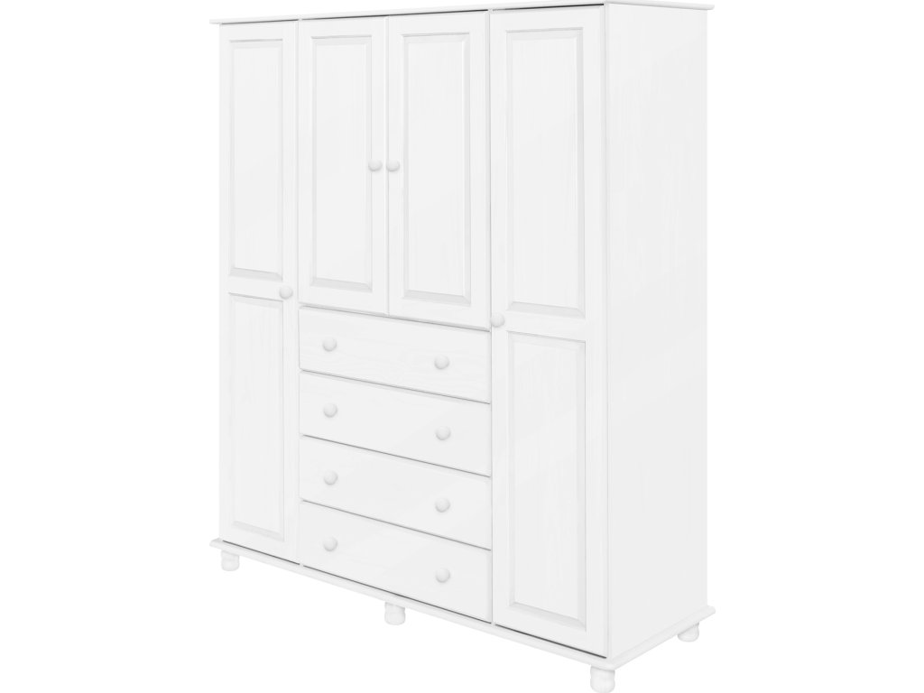 materiál masiv borovice, barevné provedení bílý lak čtyři široké zásuvky s kovovými pojezdy v levé části dvě šatní tyče, ve střední části 1 police a v pravé části 3 police doporučený nástavec 8853B
