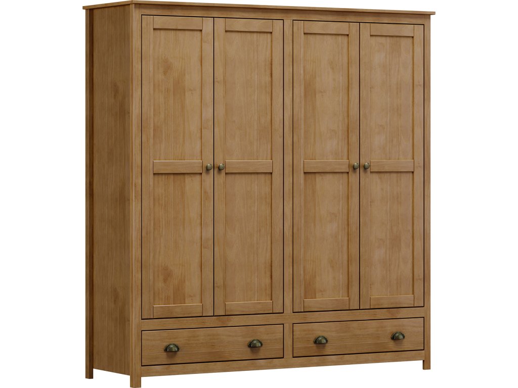 materiál masiv borovice, barevné provedení dub dvě zásuvky s kovovými úchytkami a pojezdy v levé části 3 police, v pravé části 1 police a kovová šatní tyč