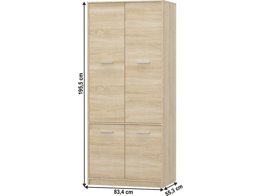 4-dveřová skříň s policemi TEYO Materiál: DTD laminovaná Barevné provedení: dub sonoma Rozměry (ŠxHxV): 83x55x195 cm Tloušťka materiálu: 16 mm Dodávána v demontu.