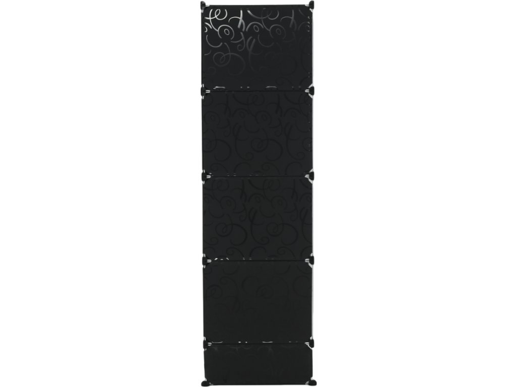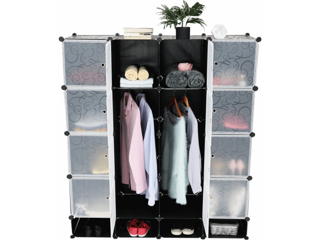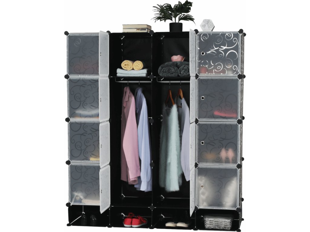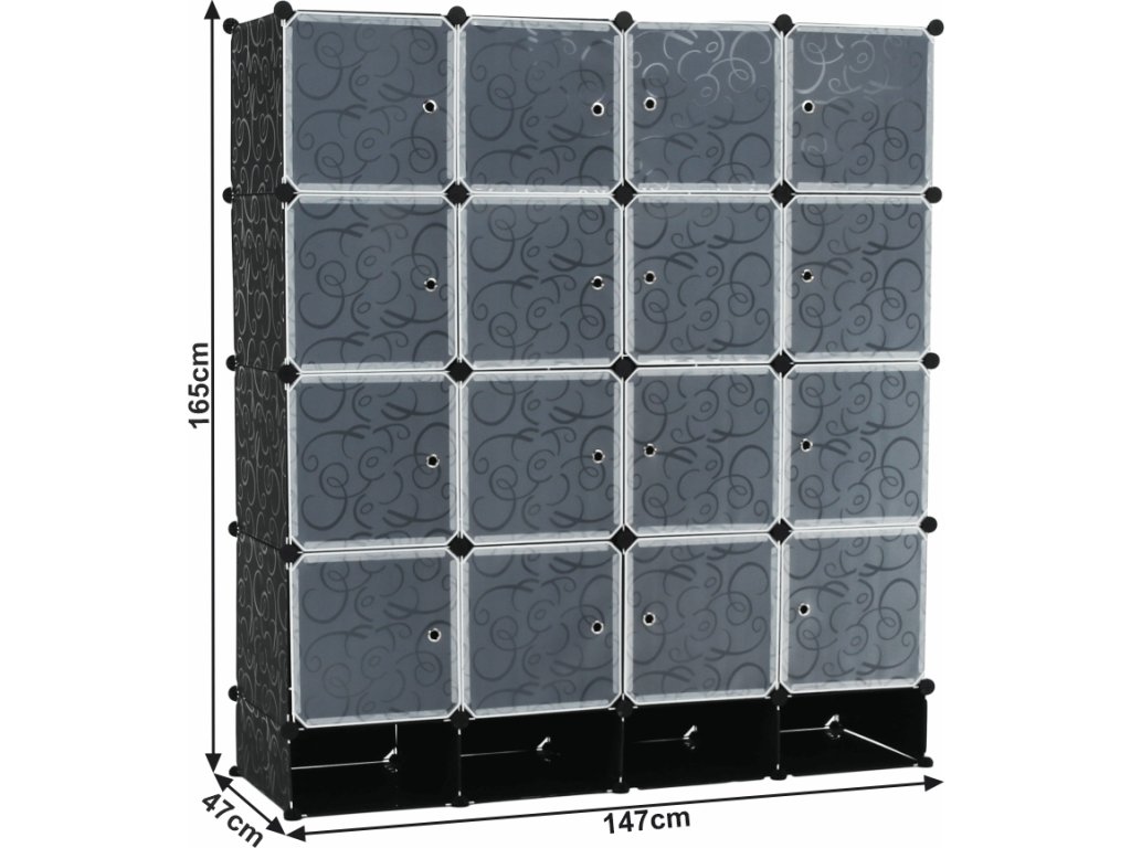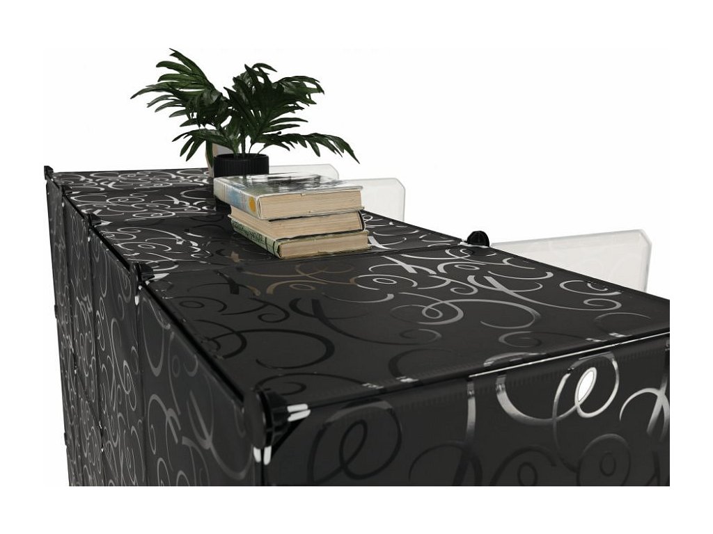 Materiál: látka / kov Barva: černá / mléčná bílá / vzor Rozměry (ŠxHxV): 147x47x165 cm Modulární typ šatníku věšáková tyč policová část Spojovací prvky vyrobené z pevného ABS plastu Různé varianty rozmístění úložných prostorů S úložným prostorem na boty Dodávané v demontu