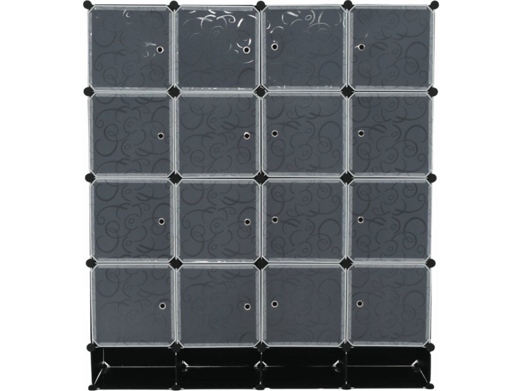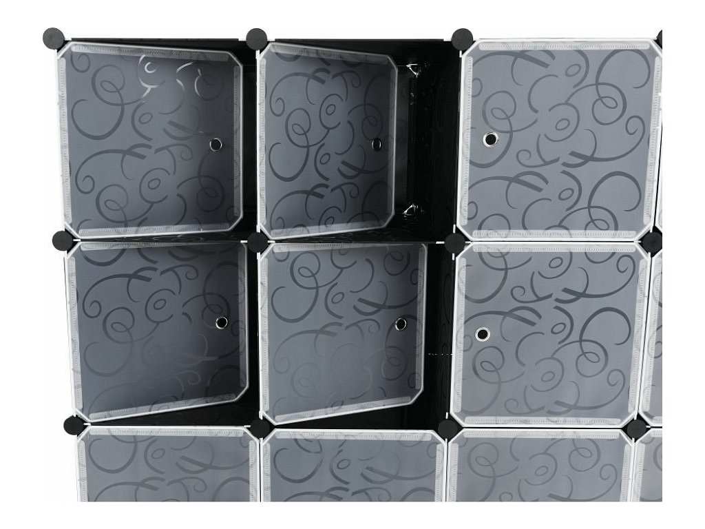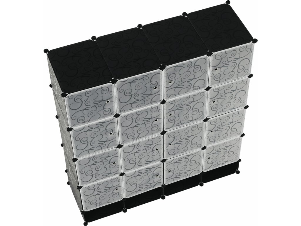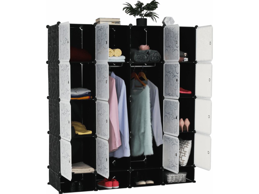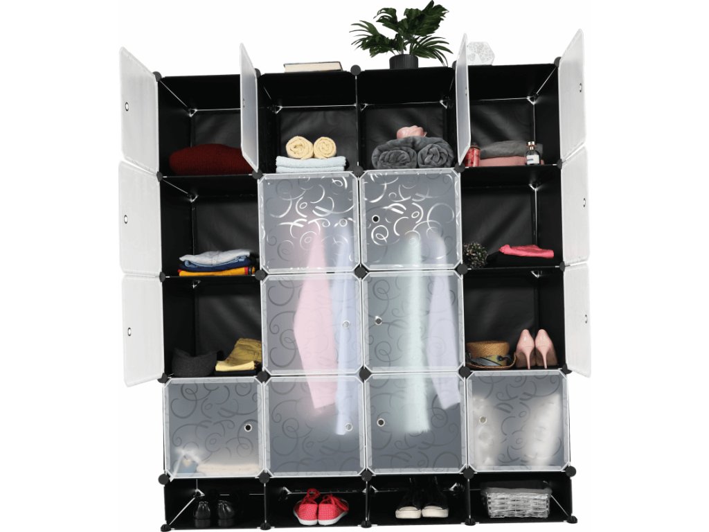 Materiál: látka / kov Barva: černá / mléčná bílá / vzor Rozměry (ŠxHxV): 147x47x165 cm Modulární typ šatníku věšáková tyč policová část Spojovací prvky vyrobené z pevného ABS plastu Různé varianty rozmístění úložných prostorů S úložným prostorem na boty Dodávané v demontu
