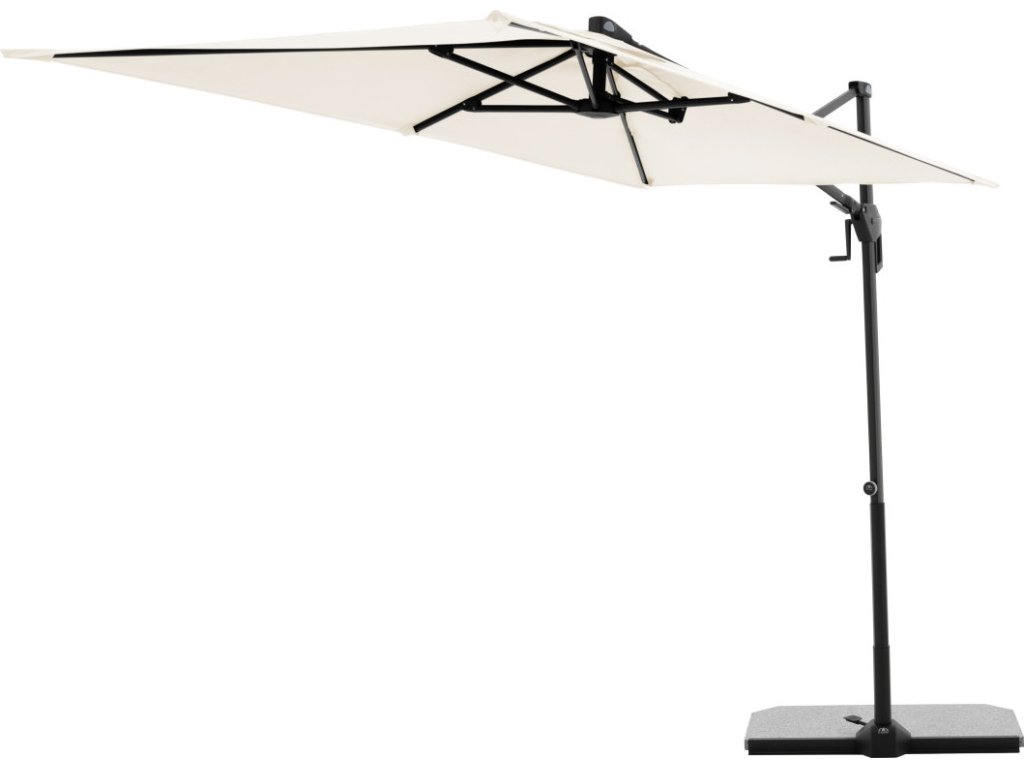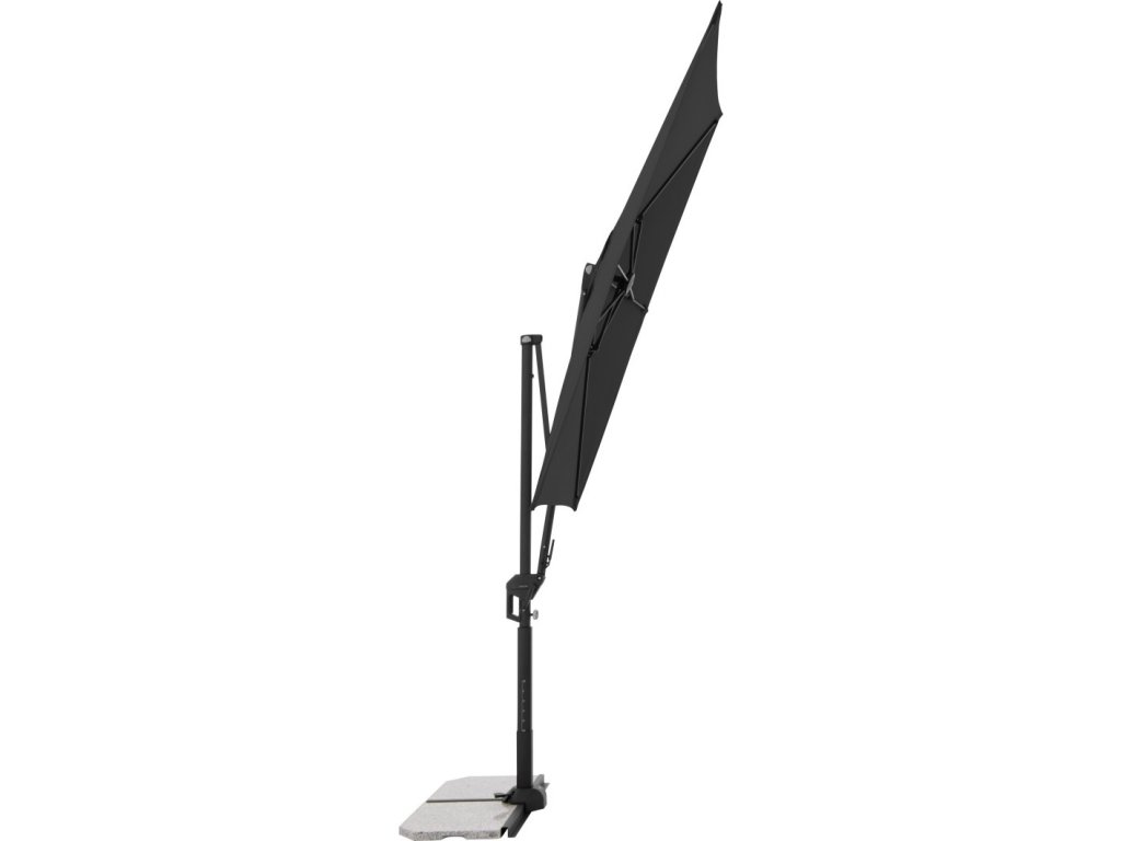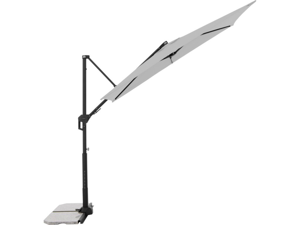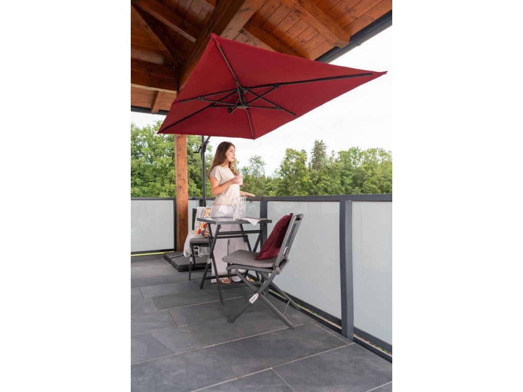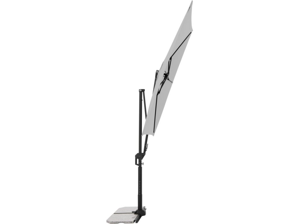 Moderní slunečník s hliníkovou konstrukcí je ideální na balkón či terasu. Snadné a pohodlné otevření a zavření slunečníku díky kličkovému mechanismu. Slunečník je výškově nastavitelný. Dá se přizpůsobit pohybu slunce během dne, otáčí se o 360°, naklápí se axiálně na obě strany a může být nastaven pod úhlem dozadu. Potah je vyroben ze 100% PET recyklované polyesterové tkaniny a má UV ochranu 50+. Touto novou kolekcí ""GREEN EDITION"" následujeme trend udržitelnosti materiálů a výrobků.