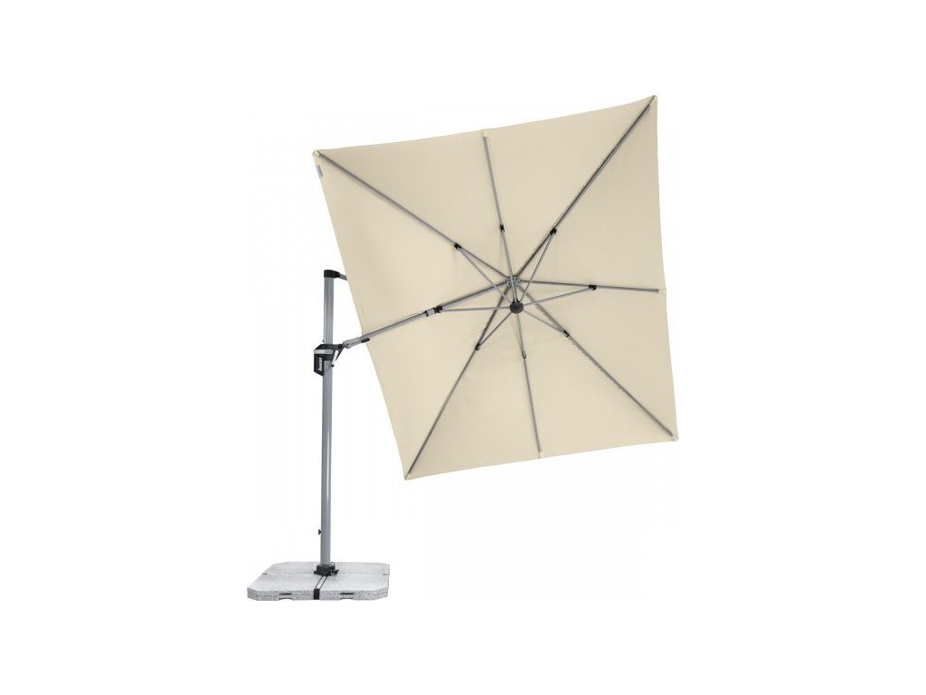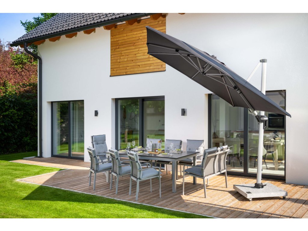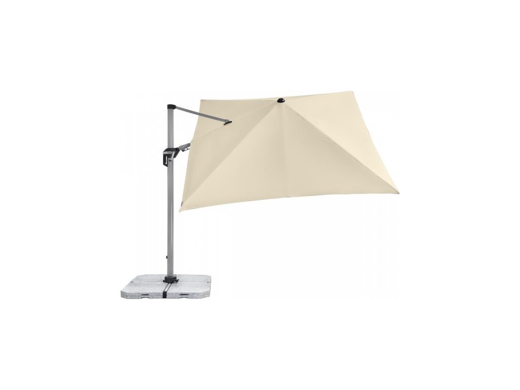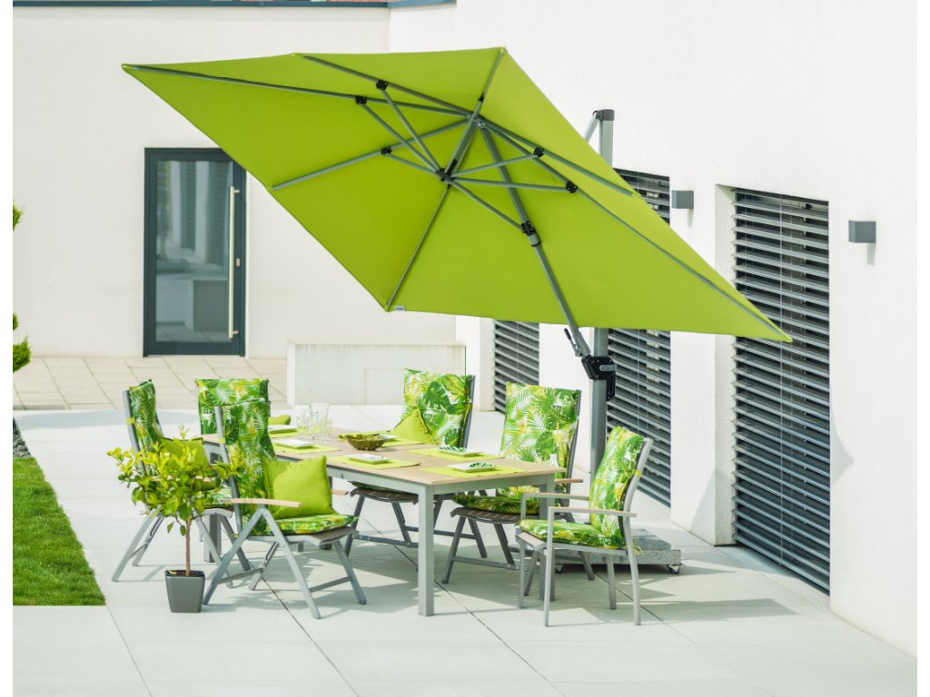 Active 350 x 260 cm je velice všestranný a vysoce kvalitní slunečník s pevným hliníkovým rámem. Obdélníkový tvar střechy je obzvláště vhodný pro zastínění zahradního nábytku. Kromě toho se slunečník dá přizpůsobit pohybu slunce během dne, protože je možné jej otočit o 360°, natočit axiálně na obě strany a může být nastaven pod úhlem dozadu, čímž se optimálně přizpůsobuje pohybu slunce. Potah je vyroben z polyesterové tkaniny odpuzující vodu s dobrou UV ochranou 50+.
