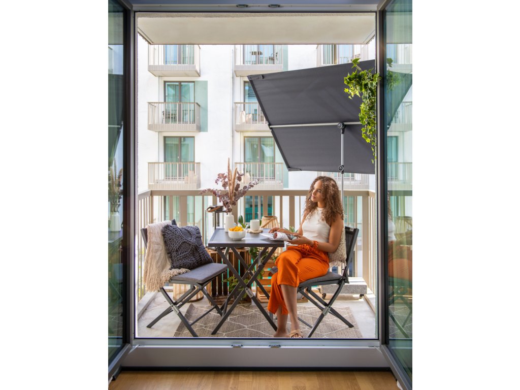 Balkónová clona je speciálně určená pro balkóny a je přizpůsobitelná pohybu slunce. Je univerzální, protože ji lze otáčet o 360°, nastavit výšku nebo naklonit / posunout na stranu. Balkónová clona je vhodná nejen pro balkóny, ale také díky mnoha funkcím pro zahradu a terasu. Clona je vyrobena z vodoodpudivé polyesterové tkaniny, která má dobrou UV ochranou 50+. Další výhodou je, že clona je snímatelná a je ji možno prát v ruce maximálně na 40 °C.