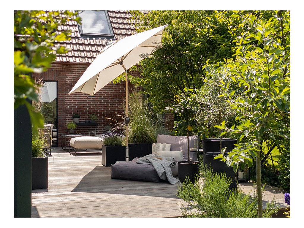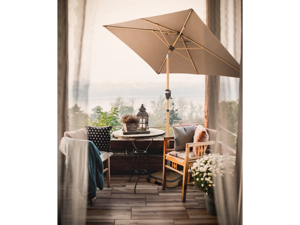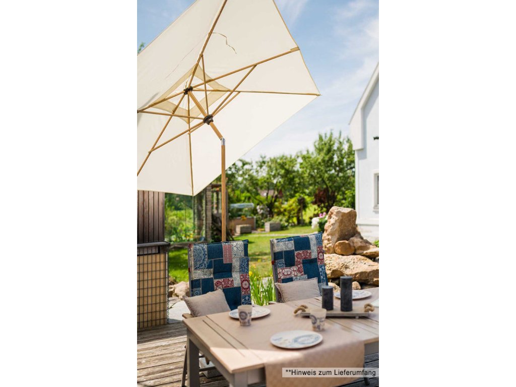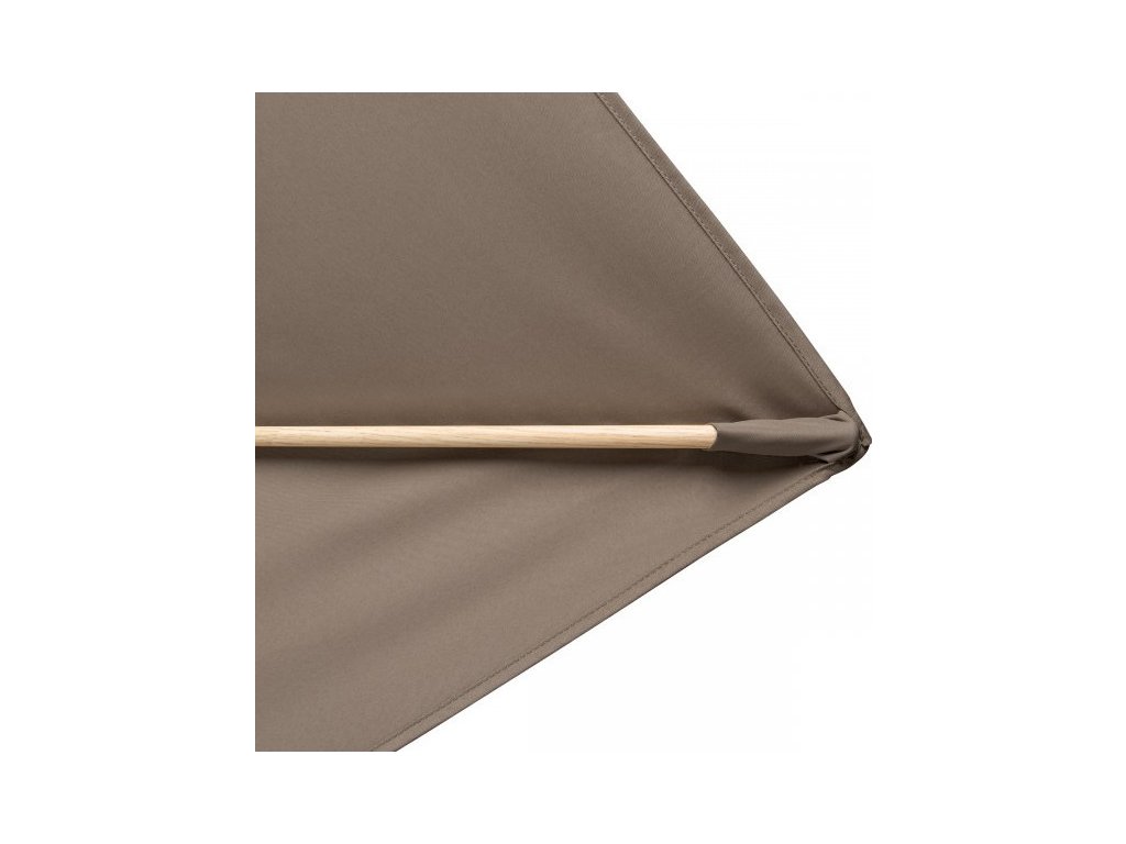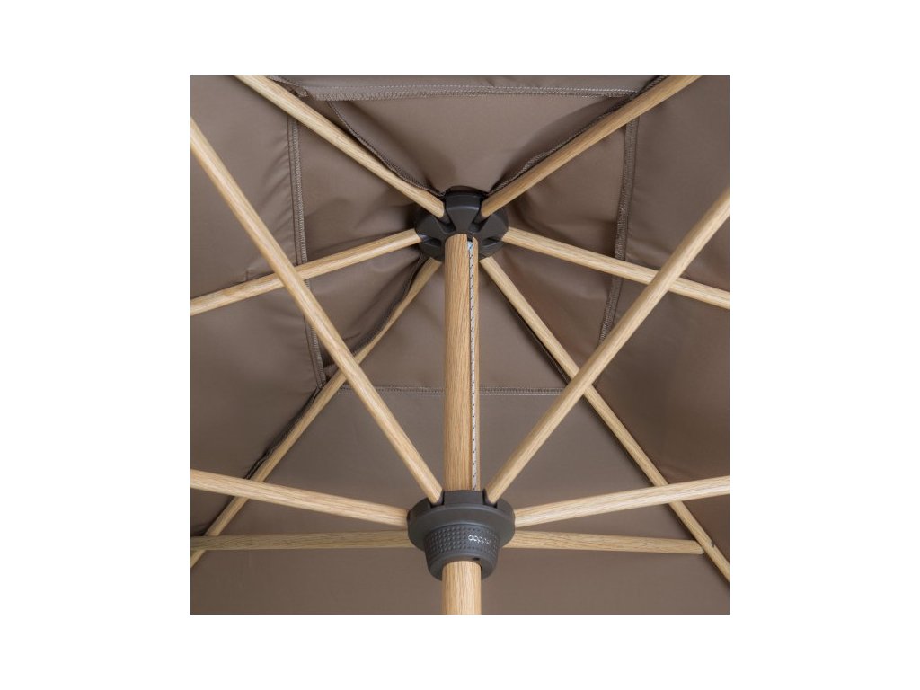 Tento slunečník udělá radost milovníkům dřeva. Díky nadčasovému vzhledu v imitaci jasanového dřeva a potahům v teplých přírodních barvách, se hodí téměř na každý balkón, terasu nebo zahradu. Slunečník nabízí uživatelsky přívětivý provoz, obsluha pomocí kličky. Slunečník má možnost výškového nastavení o 15 cm. Rám slunečníku je vyroben z vysoce kvalitního hliníku a vzpěry z oceli, což umožňuje dlouhou životnost. Potah má vynikající ochranu proti UV záření 80+. Díky ventilačnímu otvoru ve střeše se pod slunečníkem nekumuluje horký letní vzduch.