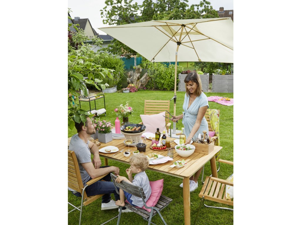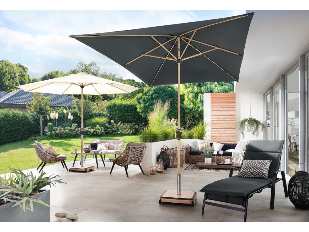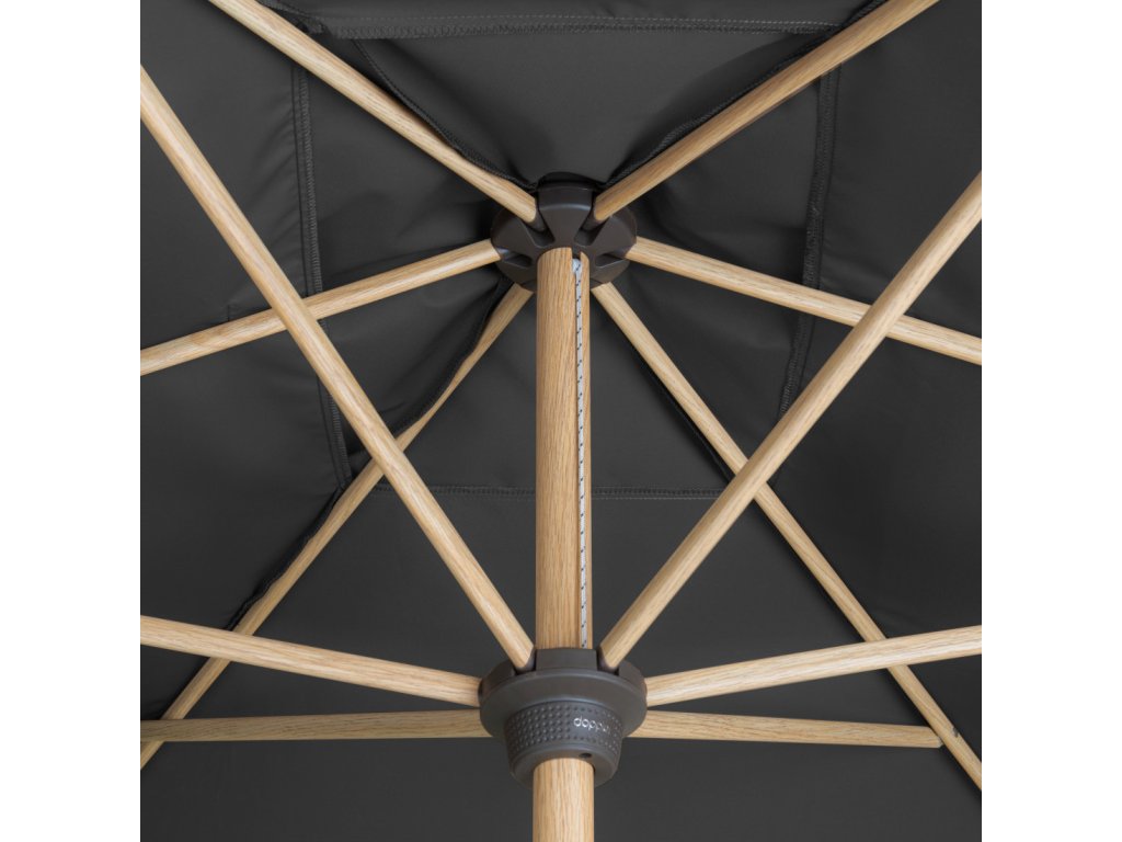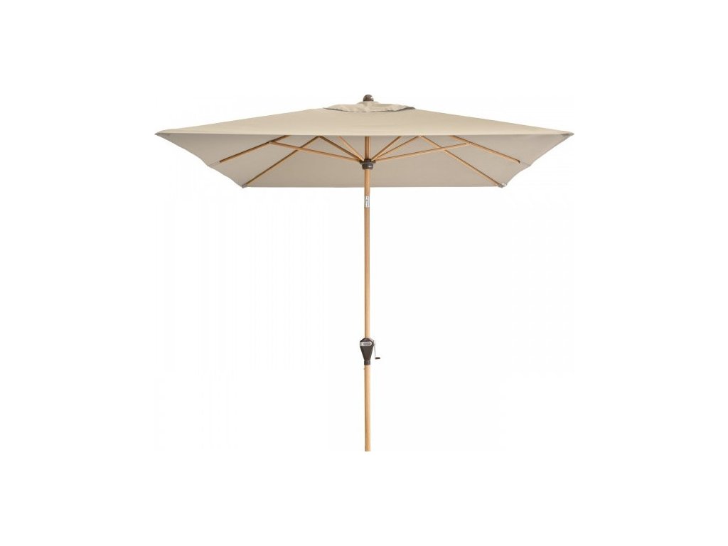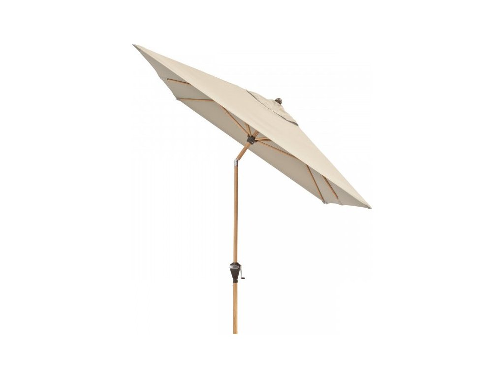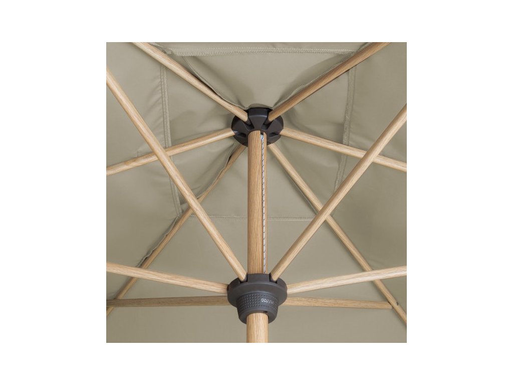 Tento slunečník udělá radost milovníkům dřeva. Díky nadčasovému vzhledu v imitaci jasanového dřeva a potahům v teplých přírodních barvách, se hodí téměř na každý balkón, terasu nebo zahradu. Slunečník nabízí uživatelsky přívětivý provoz, obsluha pomocí kličky. Má možnost naklápění do 3 pozic. Rám slunečníku je vyroben z vysoce kvalitního hliníku a vzpěry z oceli, což umožňuje dlouhou životnost. Potah má vynikající ochranu proti UV záření 80+. Díky ventilačnímu otvoru ve střeše se pod slunečníkem nekumuluje horký letní vzduch.