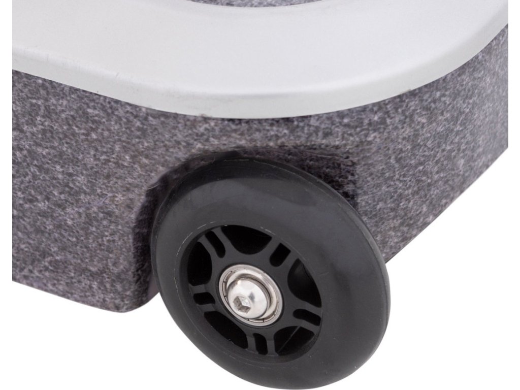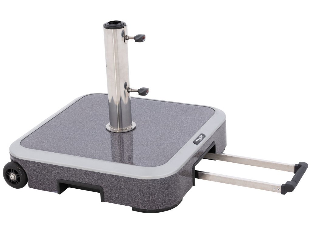 Expert Trolley 50kg - pojízdný stojan s kolečky Chcete přesunout svůj slunečník na jiné místo? Žádný problém! S moderním pojízdným stojanem Expert Troley to půjde rychle a snadno: s pomocí 2 koleček a zasouvací rukojeti se s podstavcem snadno a bez námahy manipuluje a posouvá po prostoru. Výsuvná rukojeť a kolečka s hladkým chodem umožňují snadný pohyb slunečníků. Podstavec má velice elegantní provedení a stylové hliníkové pouzdro s motivem žuly. Zaoblené hrany podstavce zabraňují nebezpečí poranění. Následně rukojeť lze snadno a prostorově úsporně uložit do základny. Slunečník lze do stojanu bezpečně ukotvit pomocí robustní nerezové trubky a dvou zajišťovacích šroubů. Součástí balení jsou redukční kroužky včetně vložek, které jsou určené pro slunečníky s průměrem stojné tyče od 32 do 60 mm (vždy je nutné zohlednit velikost slunečníku a doporučené minimální zatížení každého modelu). Technické údaje:Základní materiál: hliníkové pouzdro s motivem žuly.Horní tyč z robustní nerezové oceli (cca 30 cm).S výsuvnou rukojetí vyrobenou z nerezové oceli.Pro průměry tyčí: 32 až 60 mm.Rozměry: asi 56 x 56 x 16 cm.Hmotnost: 50 kg.