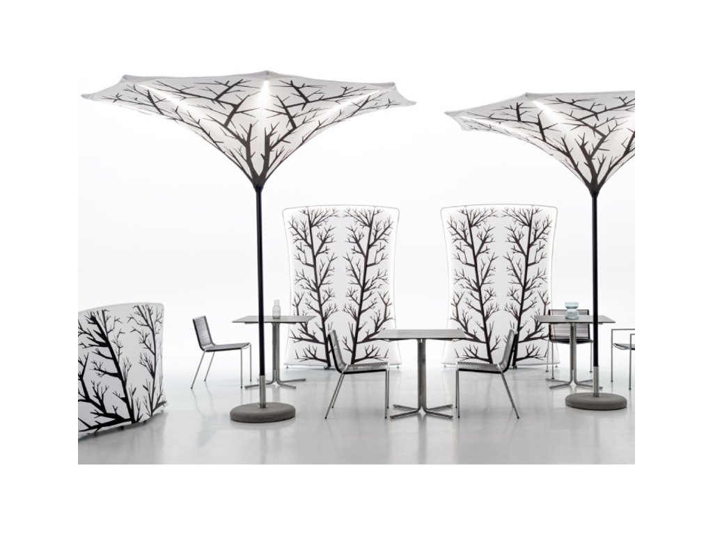 Plant je nová rada luxusných slnečníkov, ktoré boli navrhnuté predefinovaním archetypálneho tvaru objektu slnečníka, aby vytvorila ľahký, elegantný a kompaktný objem. Ideou spoločnosti je ísť nad rámec klasického konceptu ochranu pred slnkom tým, že navrhne nový spôsob interpretácie vonkajšieho tienenia prostredníctvom produktu, ktorý umožňuje presvetliť okolitý priestor. Krídlo predstavuje sériu flexibilných a mobilných priečok, ktoré sa vyznačujú silnou trojrozmernosťou a formálnou súdržnosťou.Slnečník Plant je ideálne tienenie vonkajších priestorov, ktorý zaujme nejedno zvedavé oko. Pre svoj osobitý dizajn ho často vidieť aj vo vnútroných priestoroch napríklad v nákupných zónach, kaviarniach alebo reštauračných zariadeniach. Podstavec sa predáva samostatne.Materiál: eloxovaný hliník s práškovým nástrekom v bielej (BIAN), striebornej (SILV) alebo grafitovej (GRAF) farbe.Vrchá látka: 100% akryl - s čierno bielou potlačou stromovSpodná látka: polyesterová látkaPriemer: 300 cm osemhrannýOsvetlenie: 8 LED pásikov v neutrálnom bielom svetle. Vybavený transformátorom (vstup: 230 V / výstup: 24 Watt) napájacím zdrojom, riadiacou jednotkou, diaľkovým ovládaním astmievačom.Priemer stredovej tyče: 5,5 cmVýška: 268 cmHmotnosť: 13 kg