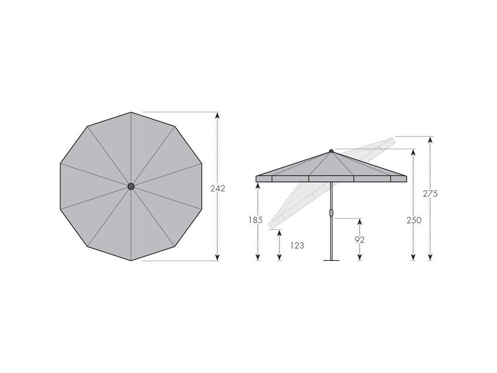 Tento slunečník je ideálním společníkem na balkón či terasu. Rám slunečníku je vyroben z oceli v antracitové barvě s epoxidovou povrchovou úpravou. Slunečník umožňuje komfortní naklopení střechy. Potah je vyroben z kvalitního nepromokavého polyesterového materiálu beze švů, který je odolný povětrnostním vlivům s dobrou UV ochranou 50+. Vhodný pro gastronomická zařízení.