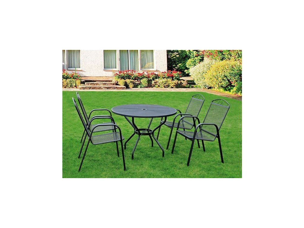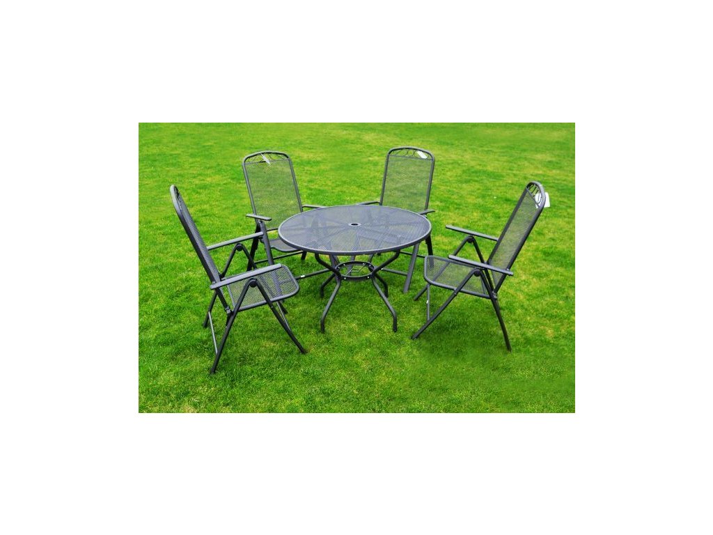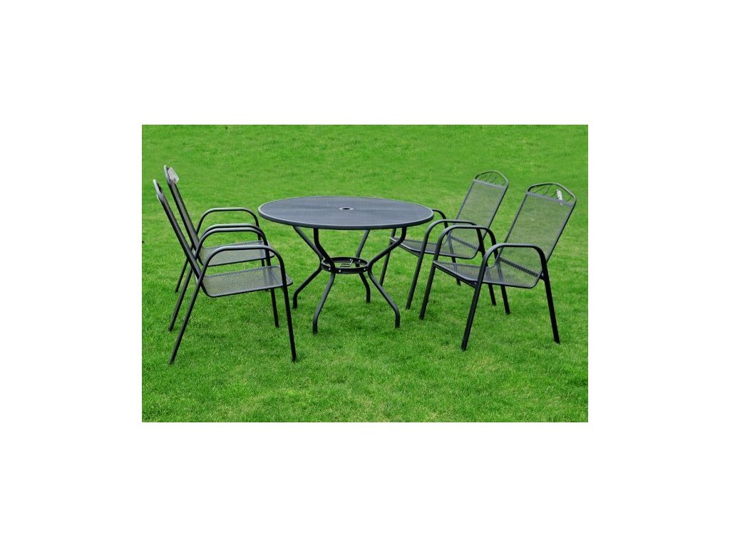 Kulatý, kovový, zahradní stůl s drátěnou vrchní deskou.