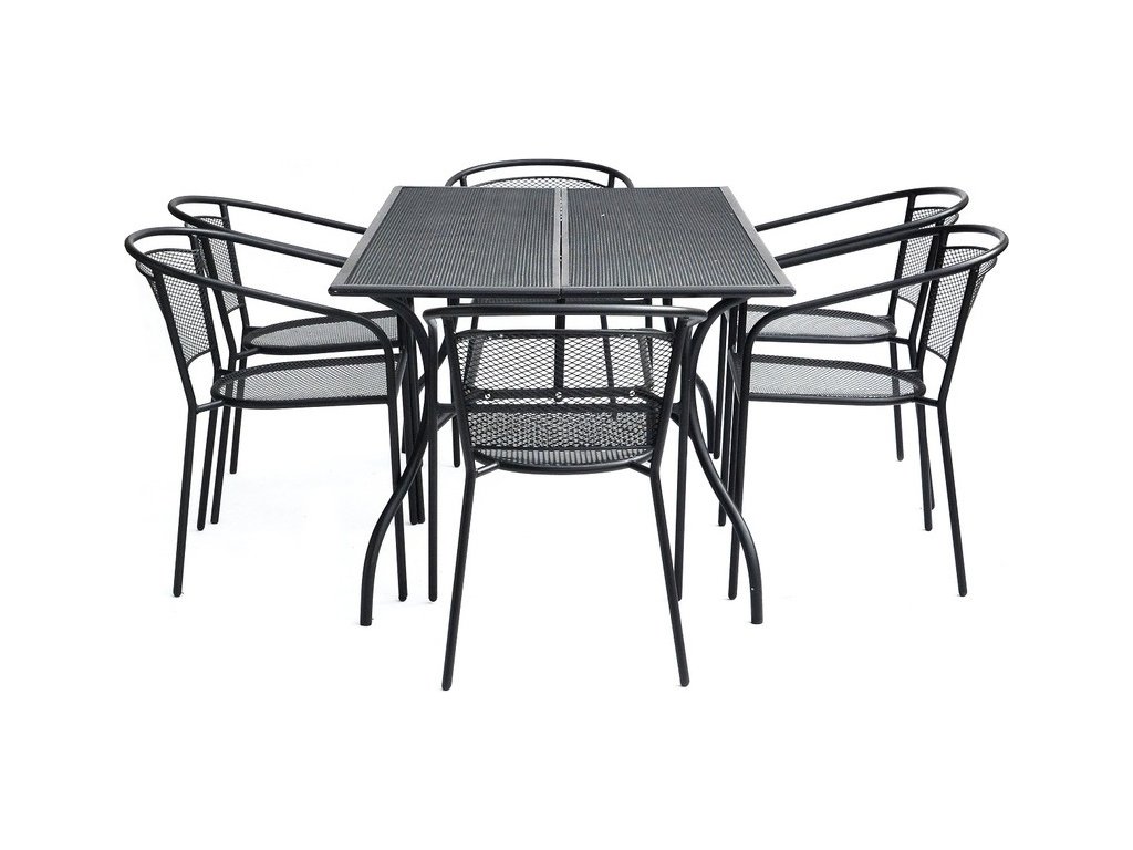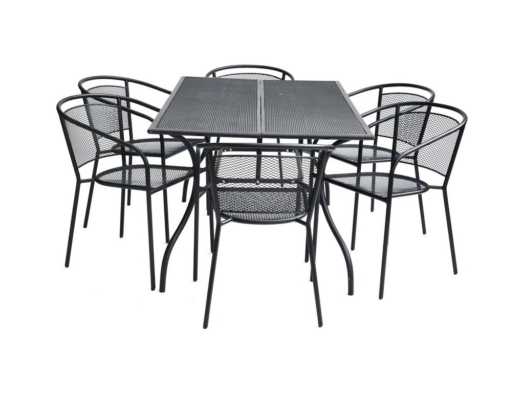 Kovový zahradní stůl s drátěnou vrchní deskou obdélníkového tvaru.