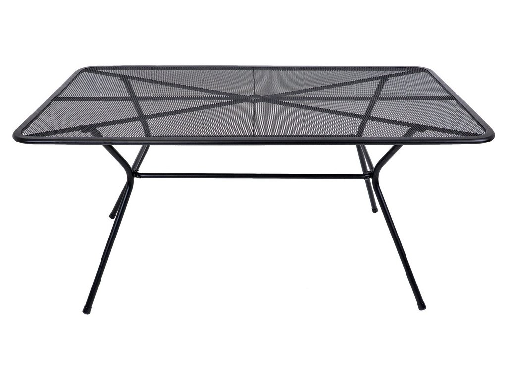 Kovový zahradní stůl s drátěnou vrchní deskou obdélníkového tvaru.