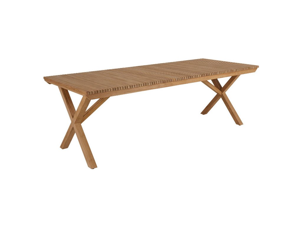 Stôl na stolovanie a zábavu. Krásna, prémiová séria s priečnymi teakovými rebrami ako opakovaným prvkom – Julita zahŕňa priame línie škandinávskeho dizajnu a vytvára štýlový vzhľad a zároveň sa prelína s okolím. Priečne teakové rebrá sú pútavým výrazom. Štýlové a pevné prekrížené nohy robia stôl rovnako krásnym aj zo strán. Materiál: prémiové teakové drevo Rozmery:šírka: 220 cmhĺbka: 90 cm výška: 73 cm Hmotnosť: 39 kg