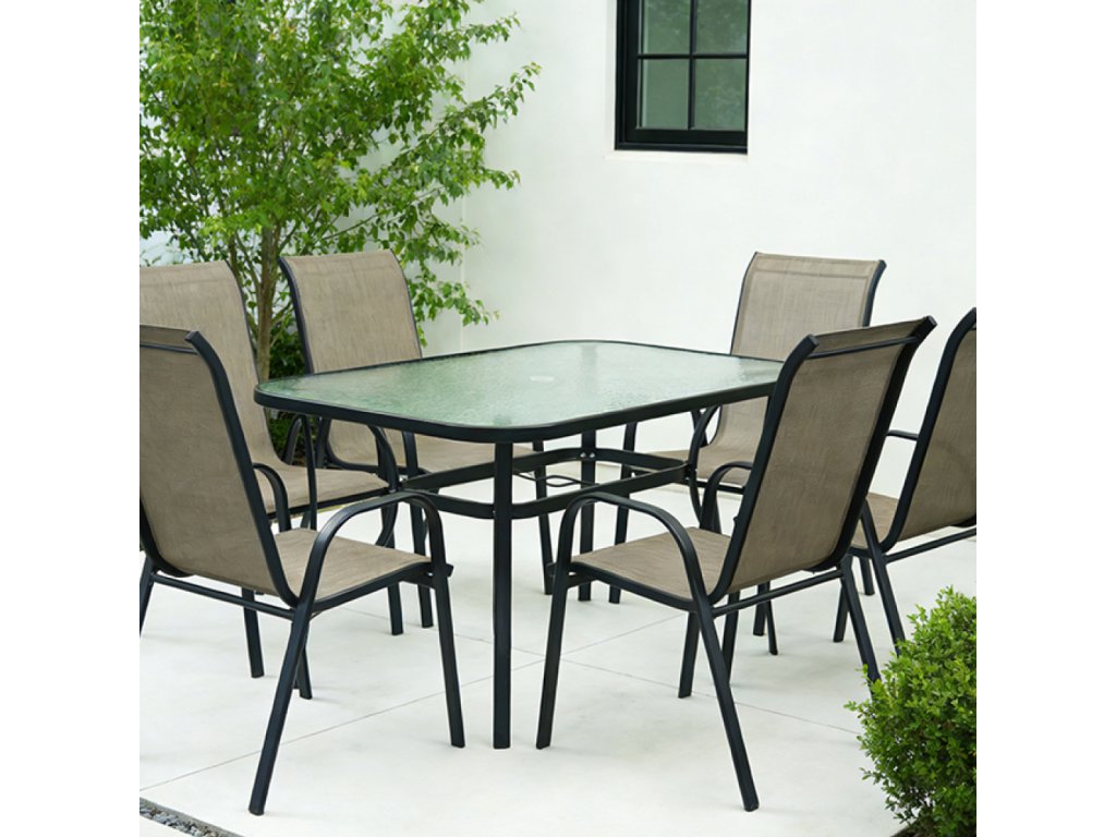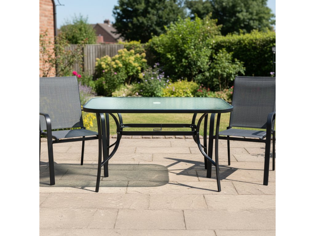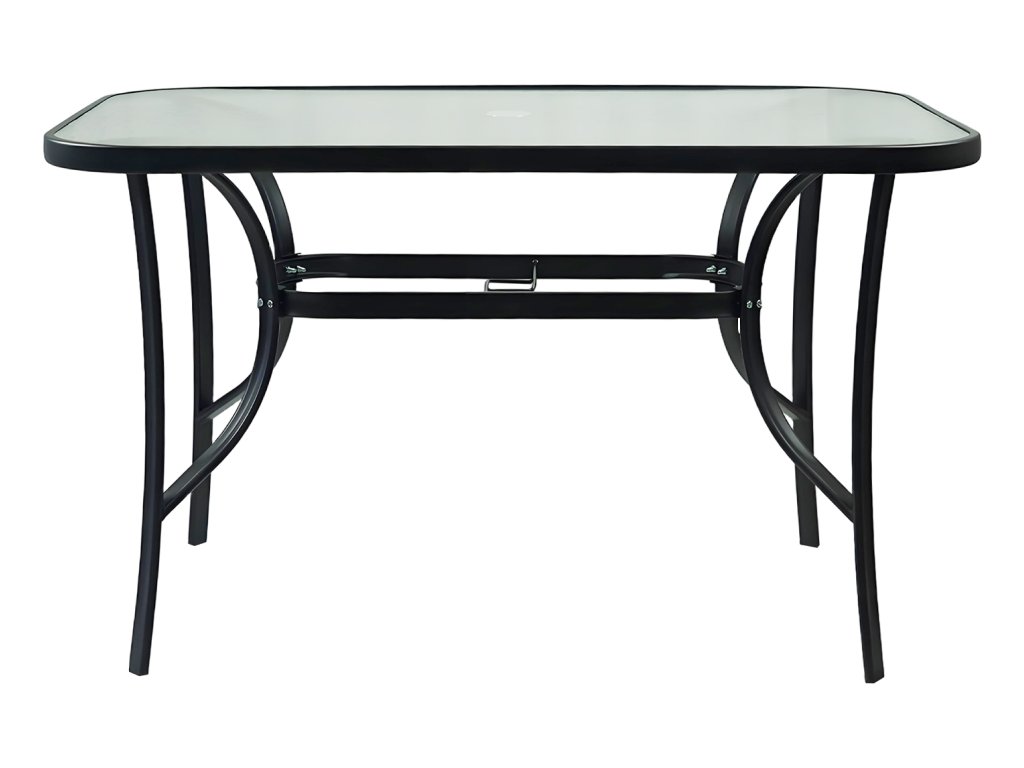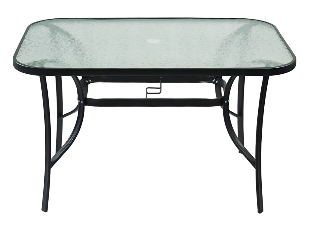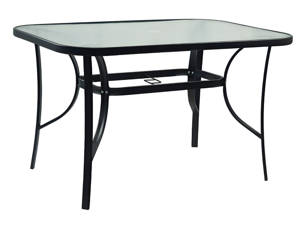 Jídelní stůl DEMAT NEW vhodný k zahradnímu setu Materiál: tvrzené sklo/ocel Barva: černá Rozměry (ŠxHxV): 120x80x70 cm S otvorem pro osazení slunečníku Nosnost: 50 kg Dodáván v demontu