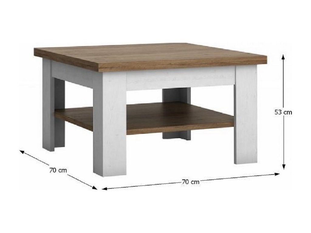 Konferenční stolek Provance v barevném provedení sosna andersen / dub lefkas. Materiál laminovaná DTD. Rozměry (ŠxHxV): 70x70x53 cm Tloušťka materiálu korpus: 22 mm Tloušťka materiálu vrchní desky: 36 mm Dodávané v demontu.