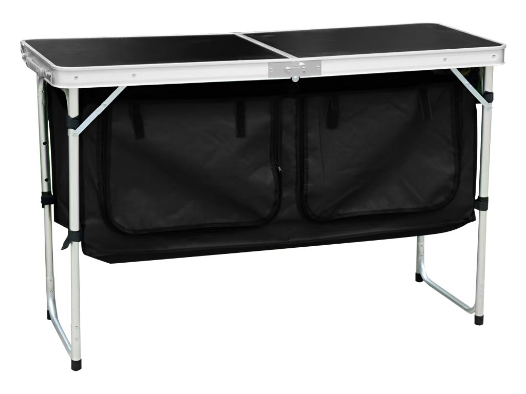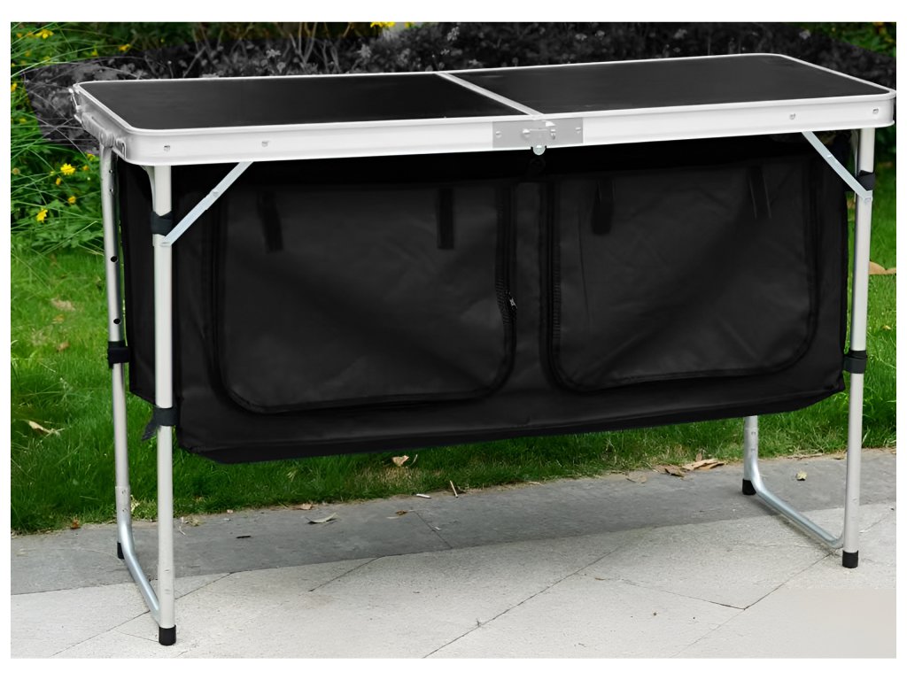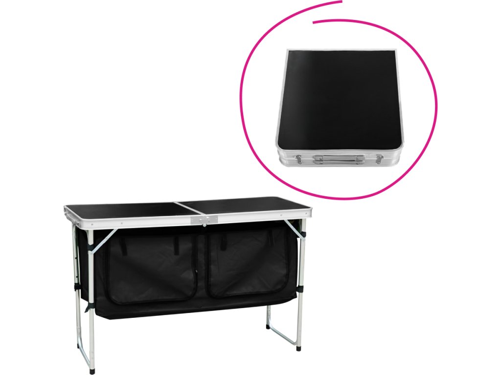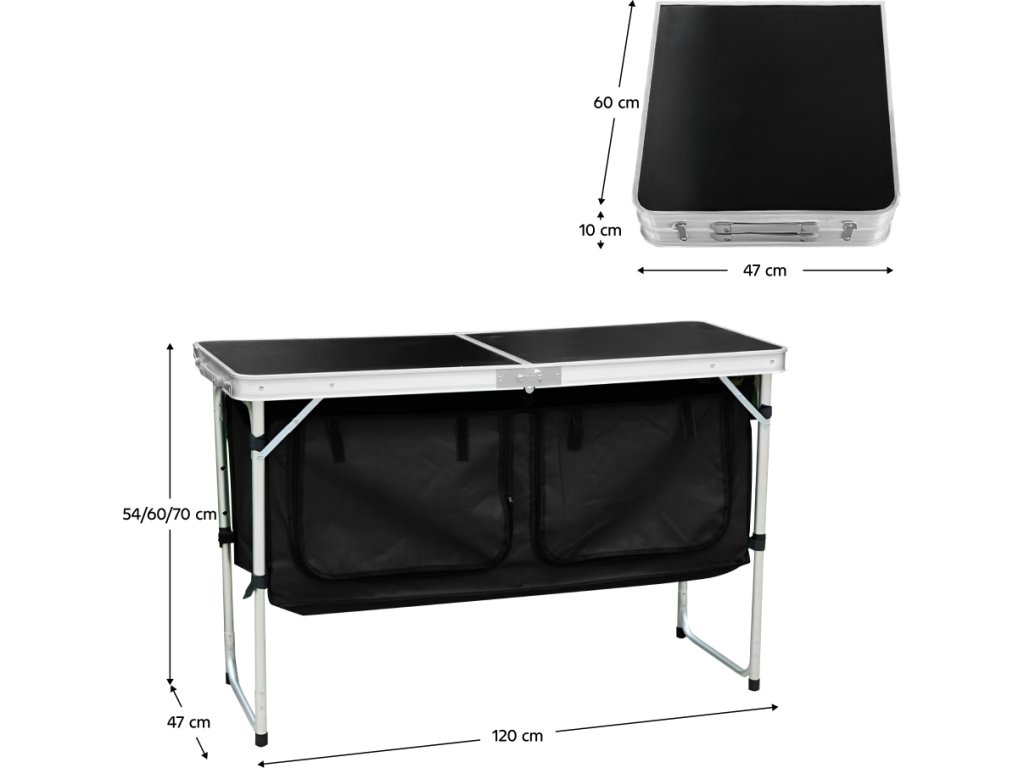 Materiál: hliník/MDF/látka Barva: šedá/černá Rozměry rozložený stůl (ŠxHxV): 120x47x54 cm Stůl je výškově nastavitelný Výši lze nastavit ve třech úrovních Nastavitelná výška: 54/60/70 cm Možnost složit do praktického boxu Rozměry složený stůl (ŠxHxV): 60x47x10 cm Dodáván s organizérem Rozměry organizéru (ŠxHxV): 105x40x40 cm 2x přihrádka na zip Rozměry přihrádky (ŠxV): 46x33 cm Možnost složit organizér Lehký a praktický Skládací Přenosný Jednoduchá manipulace a skladování Ideální pro kempování a pikniky Odolný vůči povětrnostním podmínkám Vhodný pro 4 osoby Hmotnost: 6,5 kg Nosnost: 30 kg Dodáváno v montě