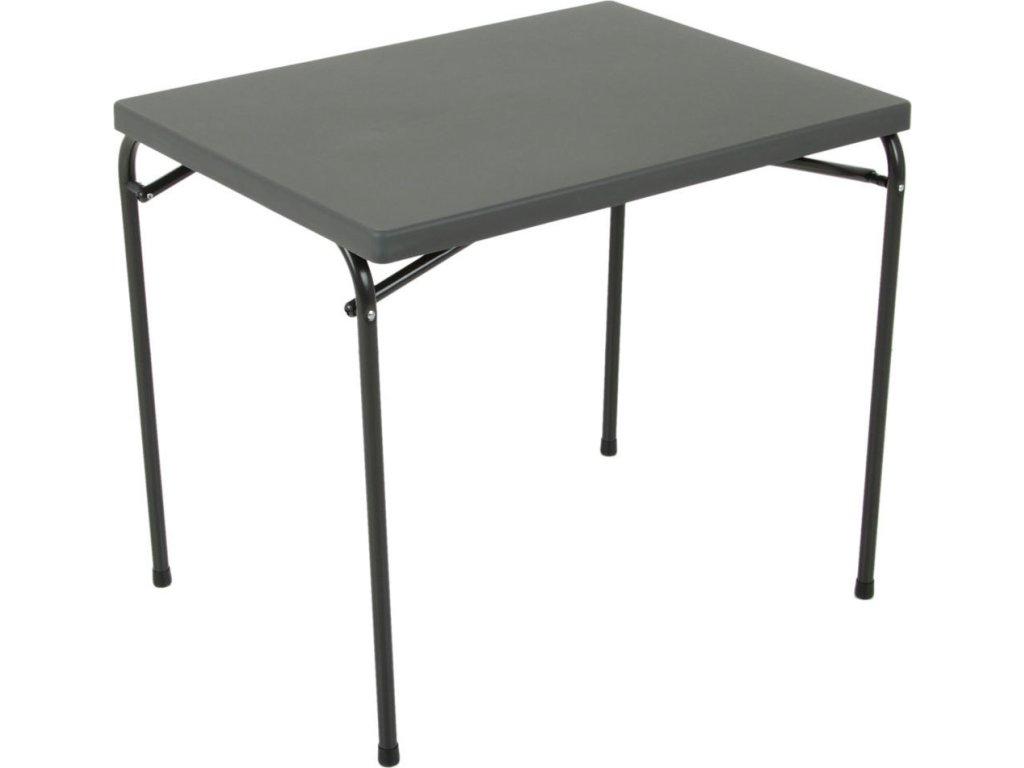 Skládací stůl s deskou obdélníkového tvaru. Plastová stolová deska a kovová konstrukce.
