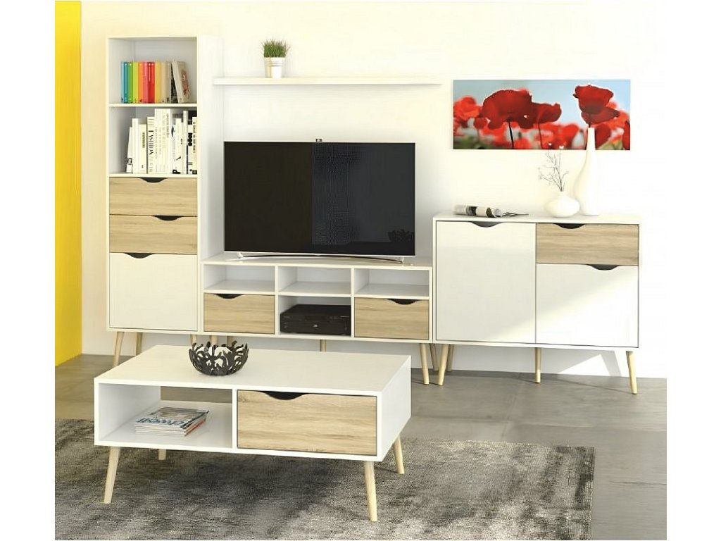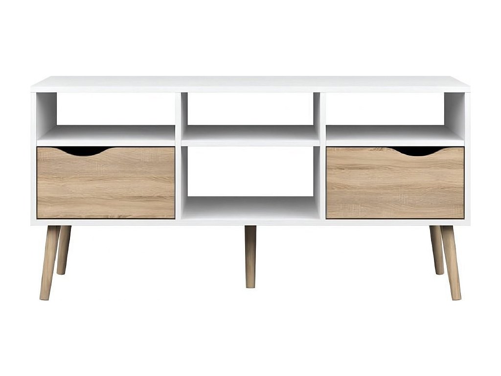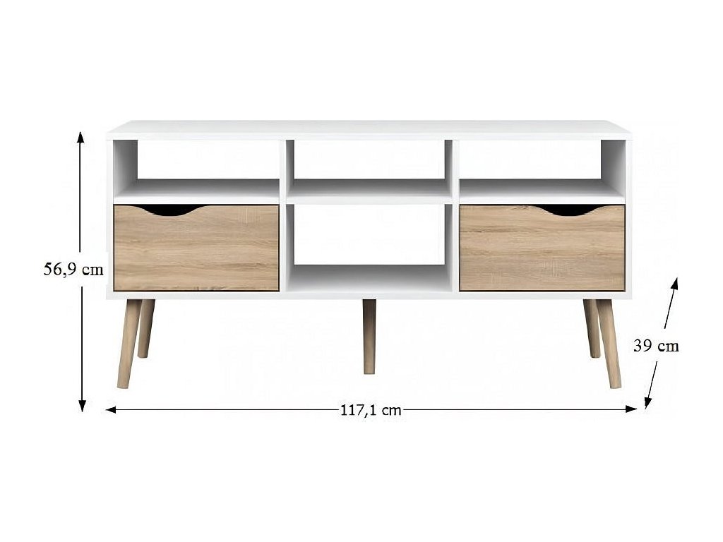 TV stolek 75391 OSLO Materiál: DTD laminovaná Provedení: dub sonoma / bílá Rozměry (ŠxHxV): 117,1x39,10x56,90 cm Výška nožiček: 15 cm Tloušťka materiálu: 1,6 cm