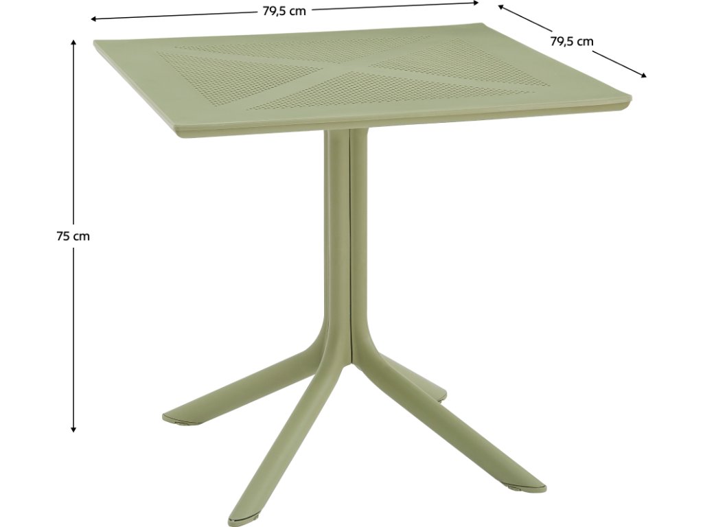 Materiál: plast Barva: zelená Rozměry (ŠxHxV): 79,5x79,5x74,5 cm Nosnost: 50 kg Hmotnost: 10,5 kg Jednoduchý Praktický Na nožičkách Jídelní/zahradní stůl Vhodný do interiéru i exteriéru Stolování pro 4 lidi Dodáváno v demontu