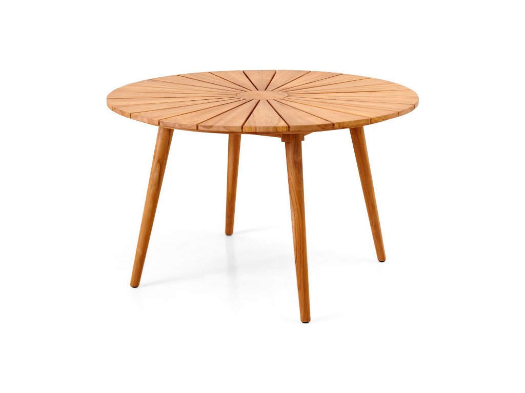Moderný okrúhly stôl s krásnym klinovým rebrovaním. Materiál: teakové drevo A kategórie Priemer dosky:120 cmVýška stola: 73 cmHmotnosť: 26 kg