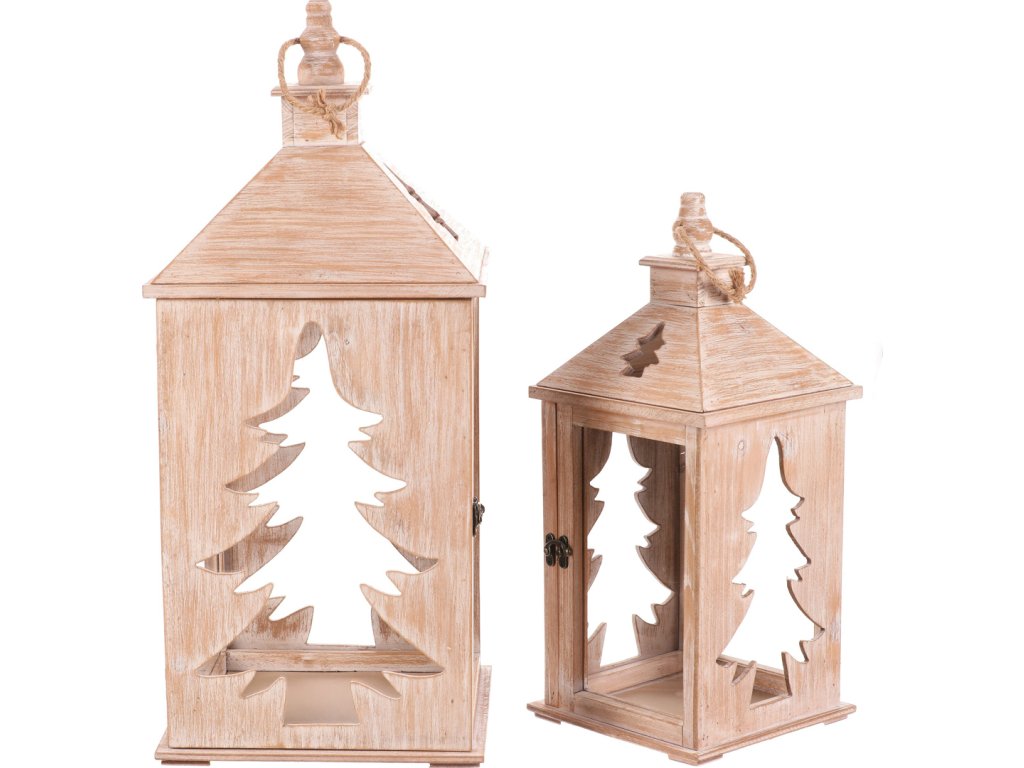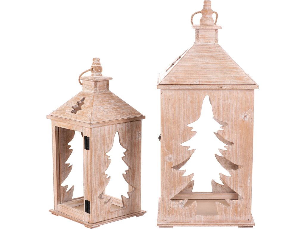 Dřevěná čtyřboká lucerna s jemně vyběleným povrchem je dokonalým doplňkem pro období Vánoc a zimy. Dvě strany zdobí vyřezaný motiv jehličnanu, který po vložení svíčky vytváří působivý světelný efekt. Lucerna je vybavena kroužkem na pověšení a je k dispozici v sadě dvou velikostí. Ideální pro zpříjemnění dlouhých zimních večerů.Doplňkové parametry