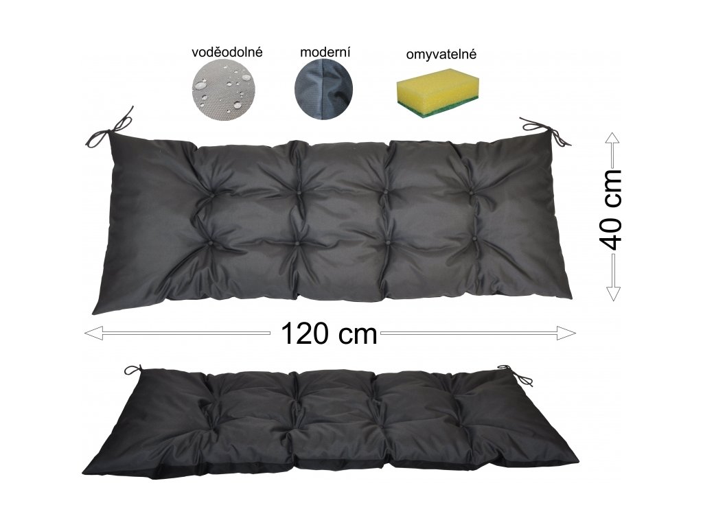 Polstr je vyrobený z voděodolné látky Oxford v šedé barvě.