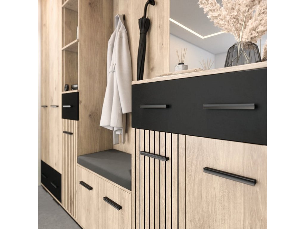 O stylový design Vaší vstupní části se postará moderní předsíňová sestava . Kombinace moderních barev a předních dvířek imitujících trendové lamely jí dodává jedinečný charakter.