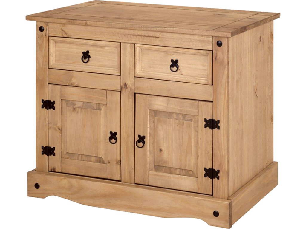 materiál masiv borovice voskovaná v medovém odstínu 2 zásuvky, 2 dvířka, 1 police, kovové ozdobné úchytky součást sestavy Corona 3
