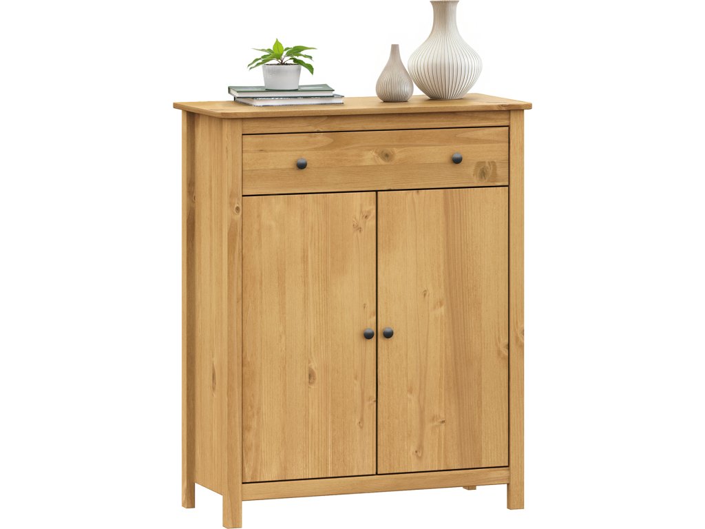 materiál masiv borovice voskovaná v medovém odstínu kovové úchytky v barevném provedení černěná mosaz 1 zásuvka s kovovými pojezdy, 2 plné dveře, 1 police maximální nosnosti uvedeny v návodu k montáži