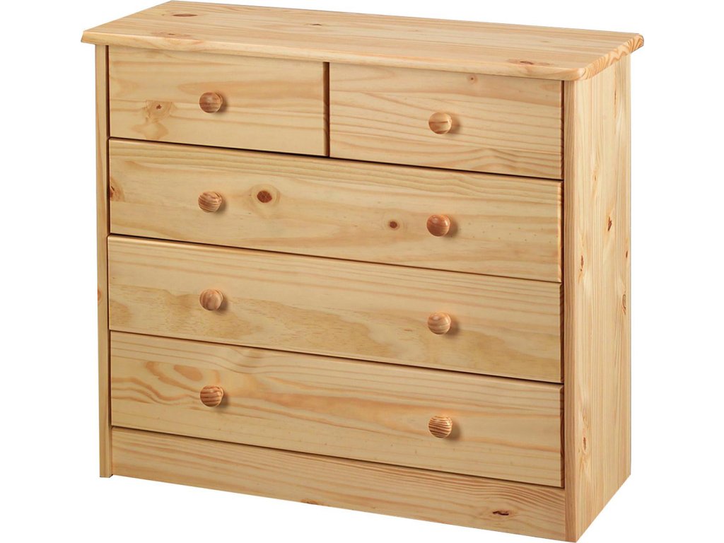 materiál masiv borovice, lakované provedení 2 úzké a 3 široké zásuvky s kovovými pojezdy, hloubka zásuvky 27,5 cm