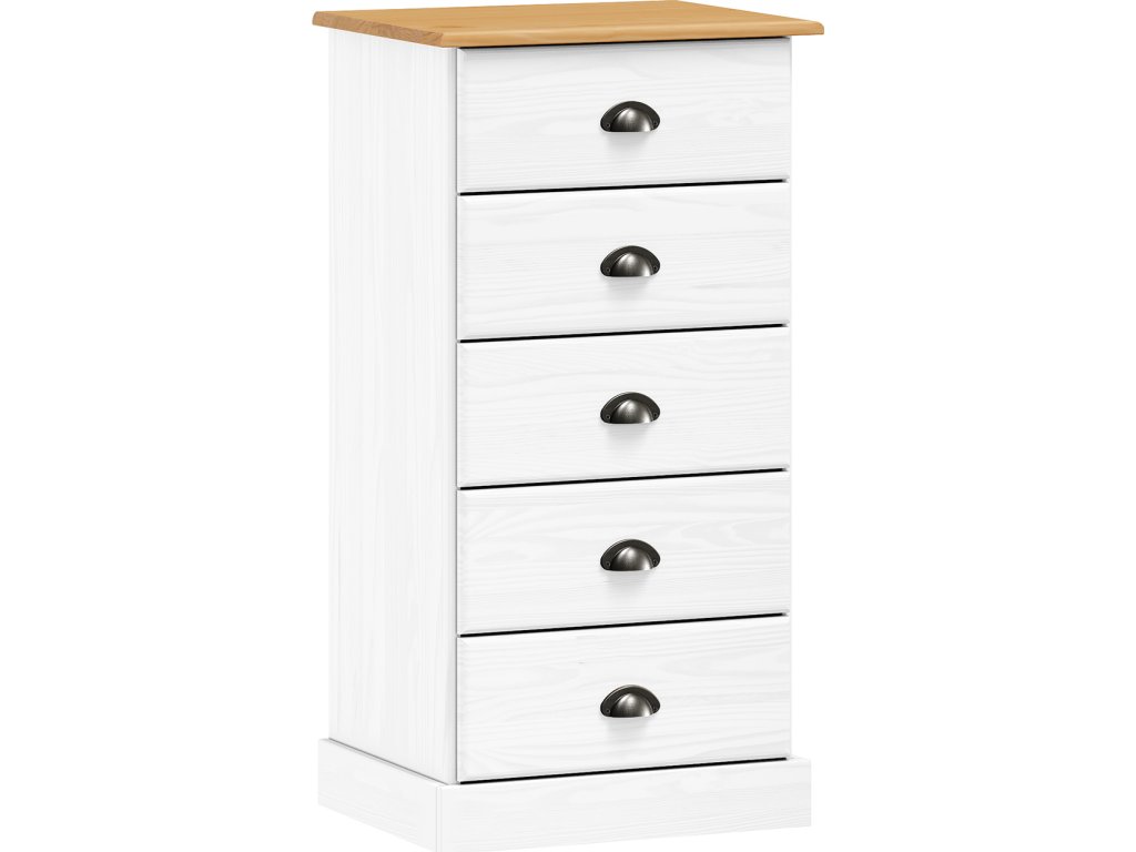 materiál masiv borovice, barevné provedení bílý lak 5 zásuvek s kovovými úchytkami a pojezdy