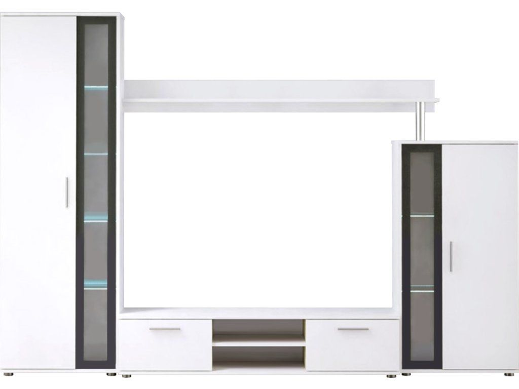 barevné provedení bílá částečně prosklené dveře, skleněné police s LED podsvícením komoda (š/h/v) 59 × 40 × 118 cm vitrína (š/h/v) 59 × 34 × 183 cm TV stolek (š/h/v) 139 × 40 × 31 cm police (š/h/v) 160 × 34 × 23 cm