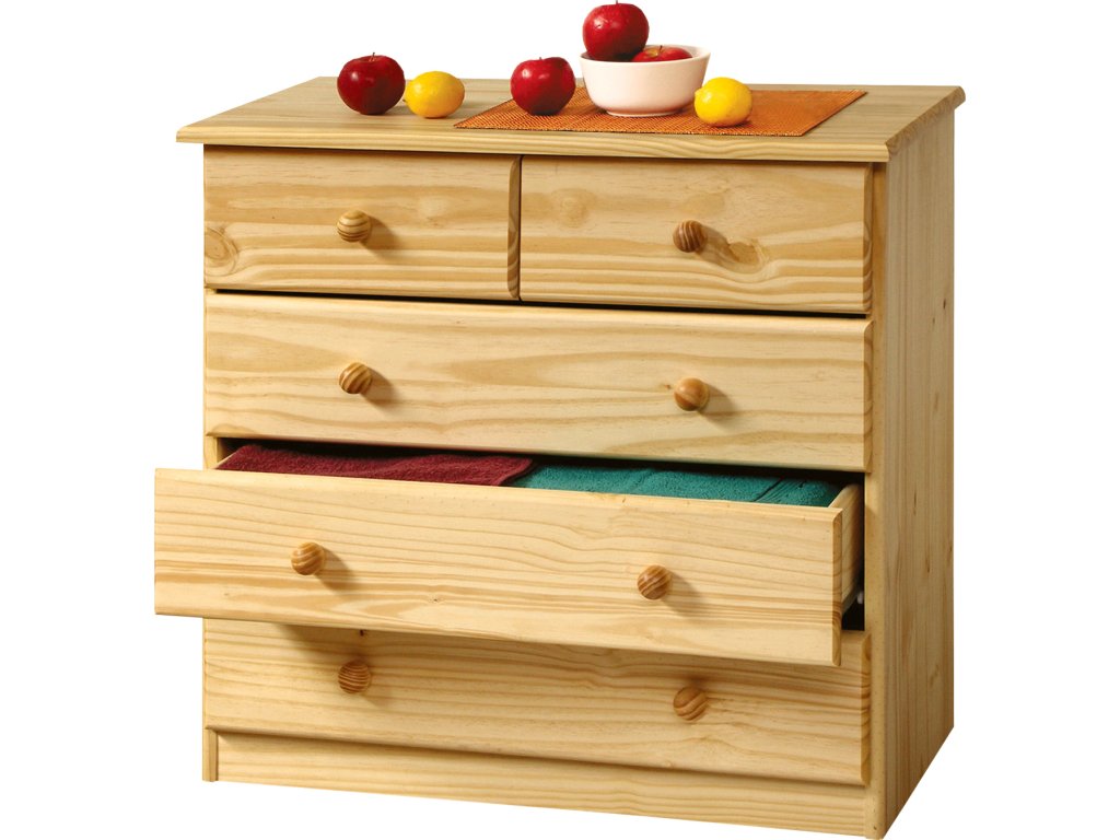 materiál masiv borovice, lakované provedení 2 úzké a 3 široké zásuvky s kovovými pojezdy, hloubka zásuvky 32,5 cm