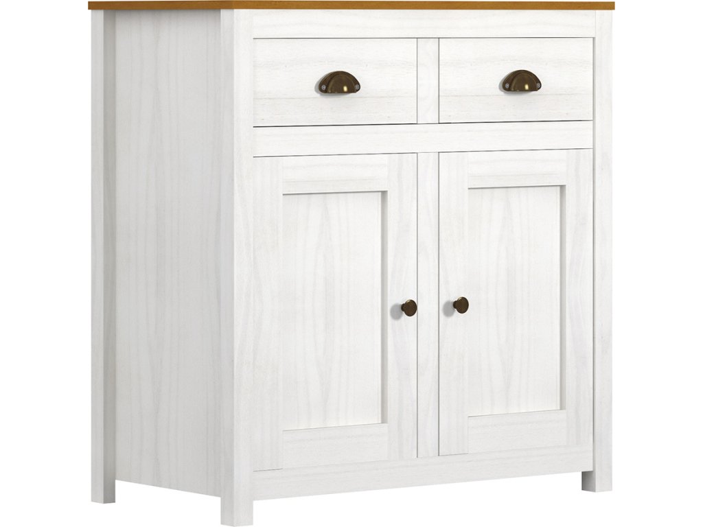 materiál masiv borovice, barevné provedení bílý / hnědý lak 2 zásuvky s kovovými úchytkami a pojezdy, 2 dveře
