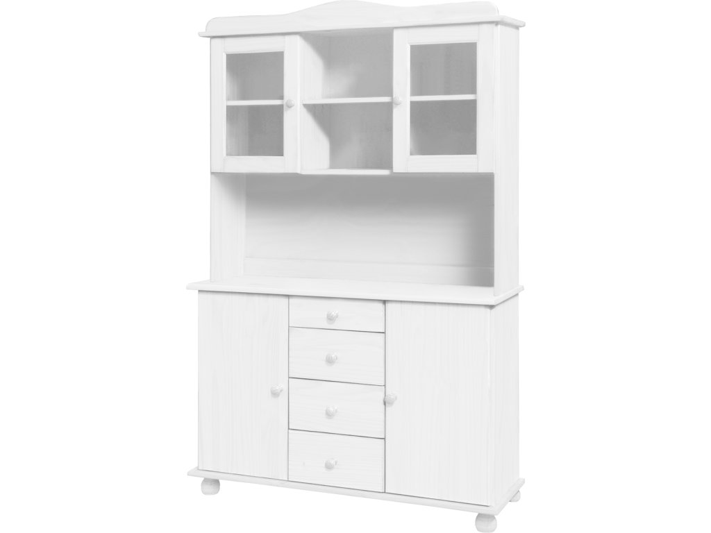 sestava příborníku 8045B a nástavce 8046B materiál masiv borovice, barevné provedení bílý lak příborník: 4 zásuvky s kovovými pojezdy, 2 skříňky s dvířky vybavené policí nástavec: 2 prosklená dvířka rozměr příborníku (š/h/v) 119 × 38 × 81 cm rozměr nástavce (š/h/v) 119 × 30 × 108 cm