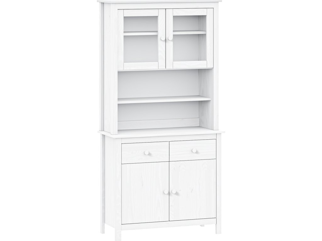sestava příborníku TORINO 8095B a nástavce TORINO 8096B materiál masiv borovice, barevné provedení bílý lak příborník: 2 zásuvky s kovovými pojezdy, 2 plné dveře, 1 police nástavec: 2 prosklené dveře, 1 police rozměr příborníku (š/h/v) 90 × 40 × 80 cm rozměr nástavce (š/h/v) 90 × 33 × 100 cm