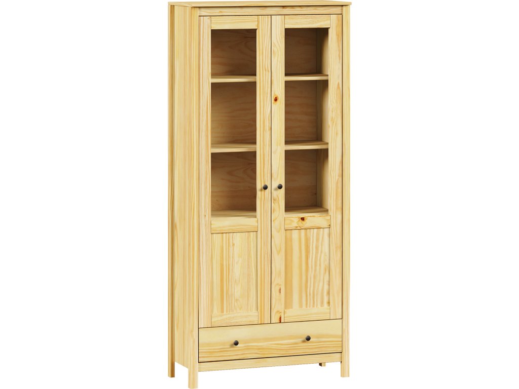 materiál masiv borovice, lakované provedení kovové úchytky dvoje částečně prosklené dveře, tři police jedna zásuvka s kovovými pojezdy