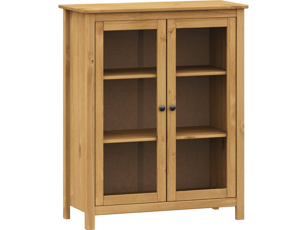 materiál masiv borovice voskovaná v medovém odstínu kovové úchytky v barevném provedení černěná mosaz 2 prosklené dveře, 2 police maximální nosnosti uvedeny v návodu k montáži