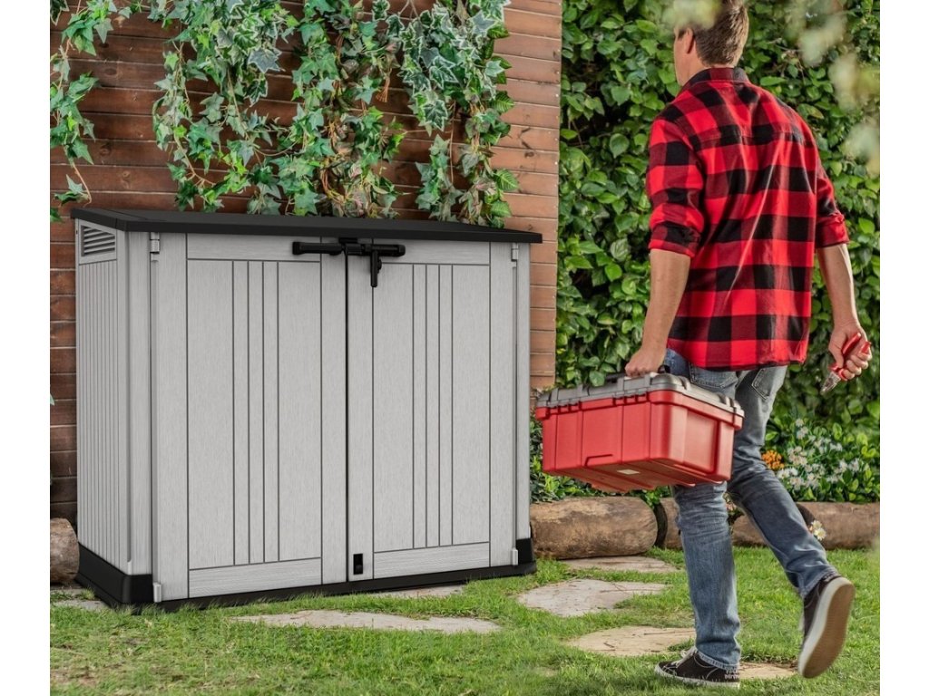 Úložná skříň se hodí všude, kde je nutné uschovat zahradní doplňky, nářadí nebo např. popelnice (dvě popelnice o objemu 120l).