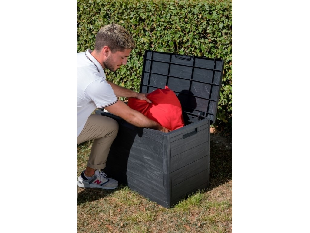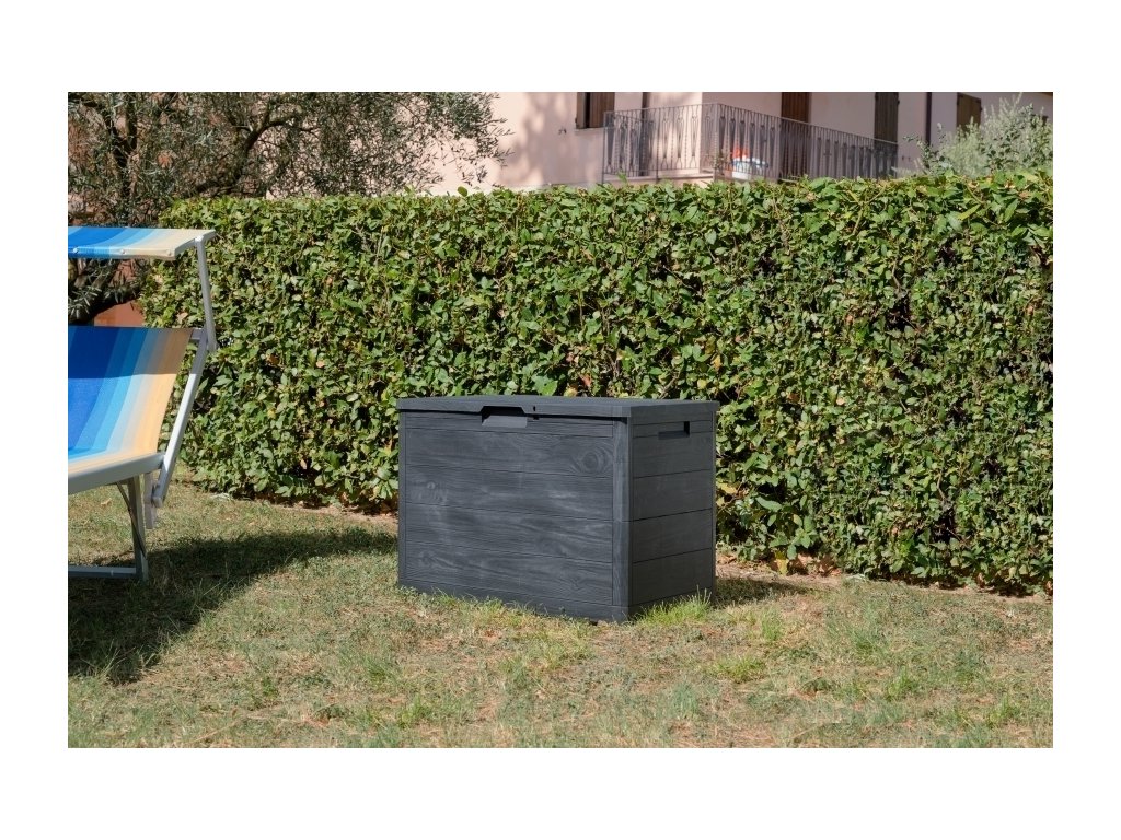WOODYS 160 l Vás okouzlí svým přírodním vzhledem dřevěného povrchu. Tento plastový box se nejen skvěle hodí do jakéhokoli zahradního prostředí, ale také dodá Vašemu exteriéru nezaměnitelný šarm.