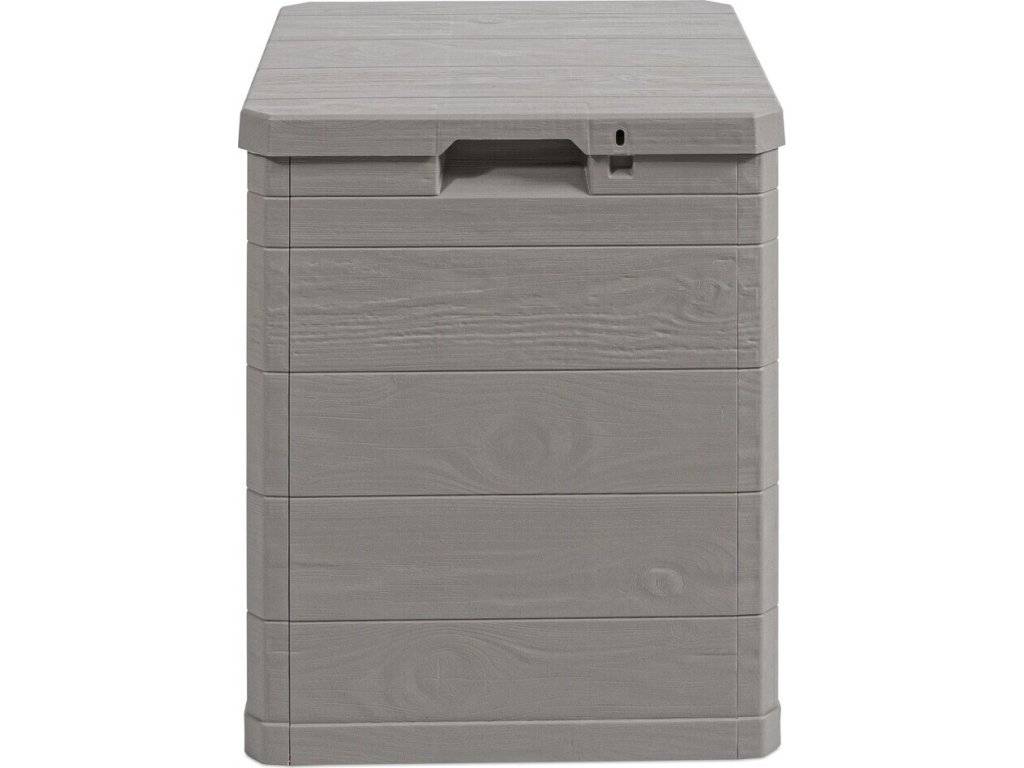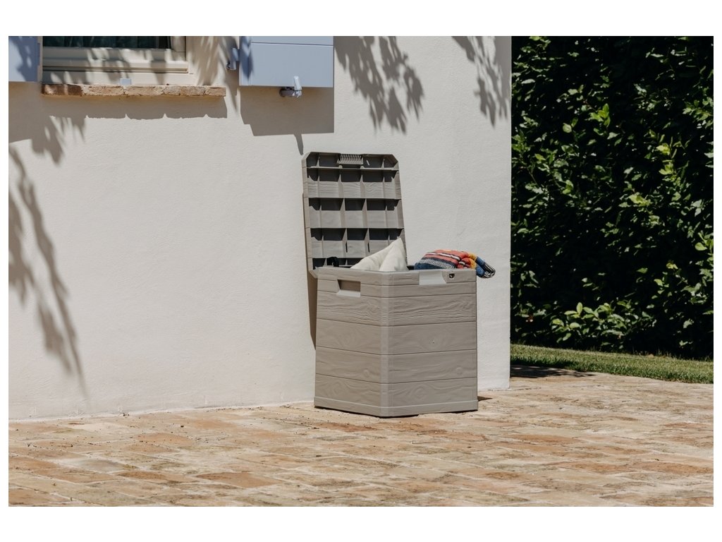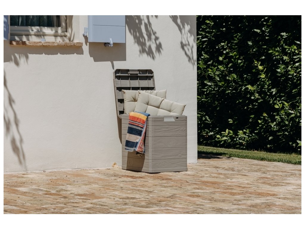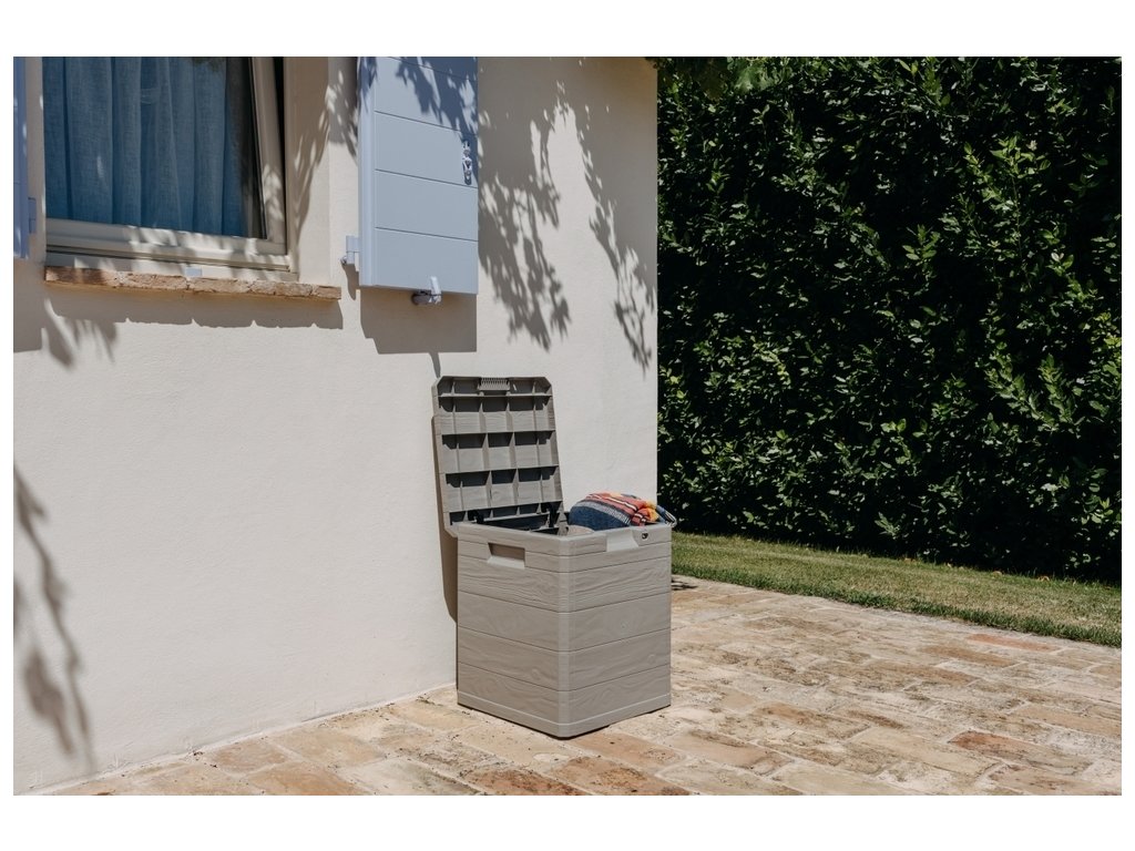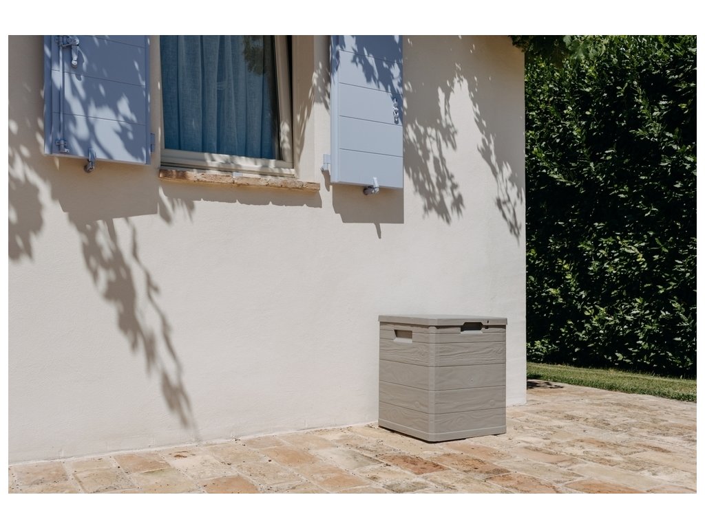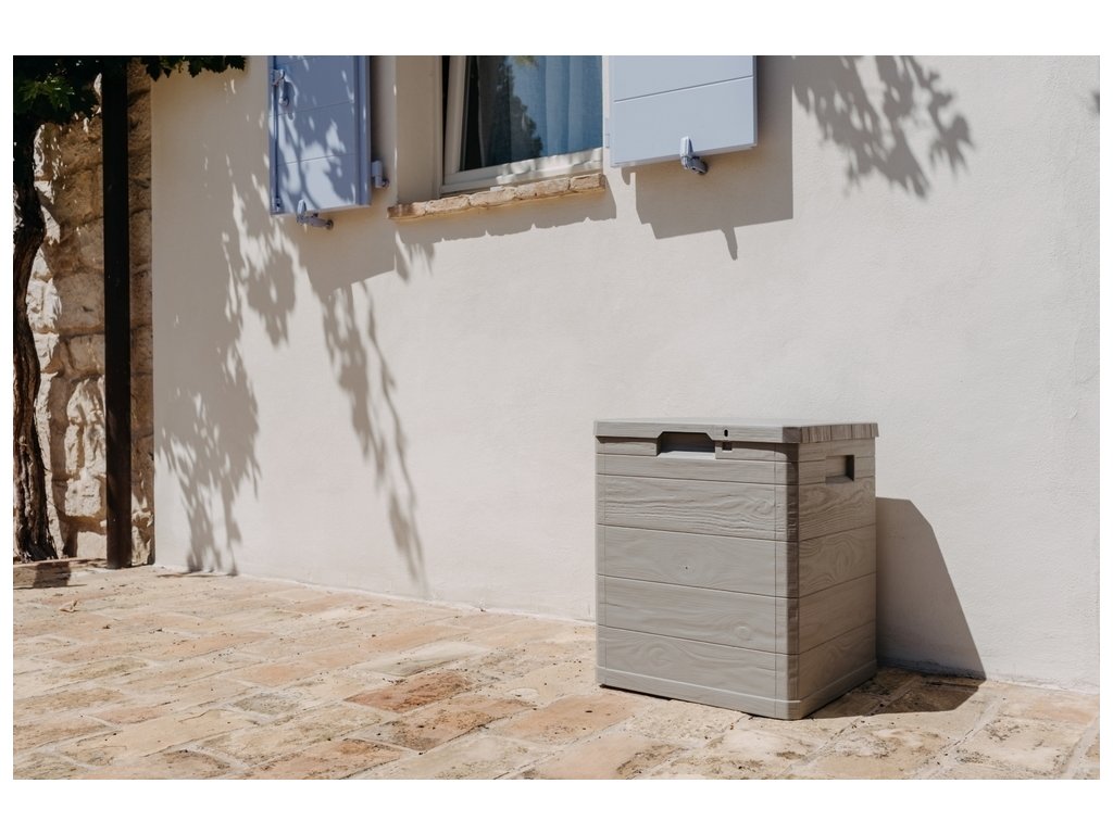 Díky svému atraktivnímu designu se tento box skvěle hodí do jakékoli zahrady nebo na terasu. Jeho imitace dřevěného povrchu přidává do prostoru příjemný rustikální šarm.