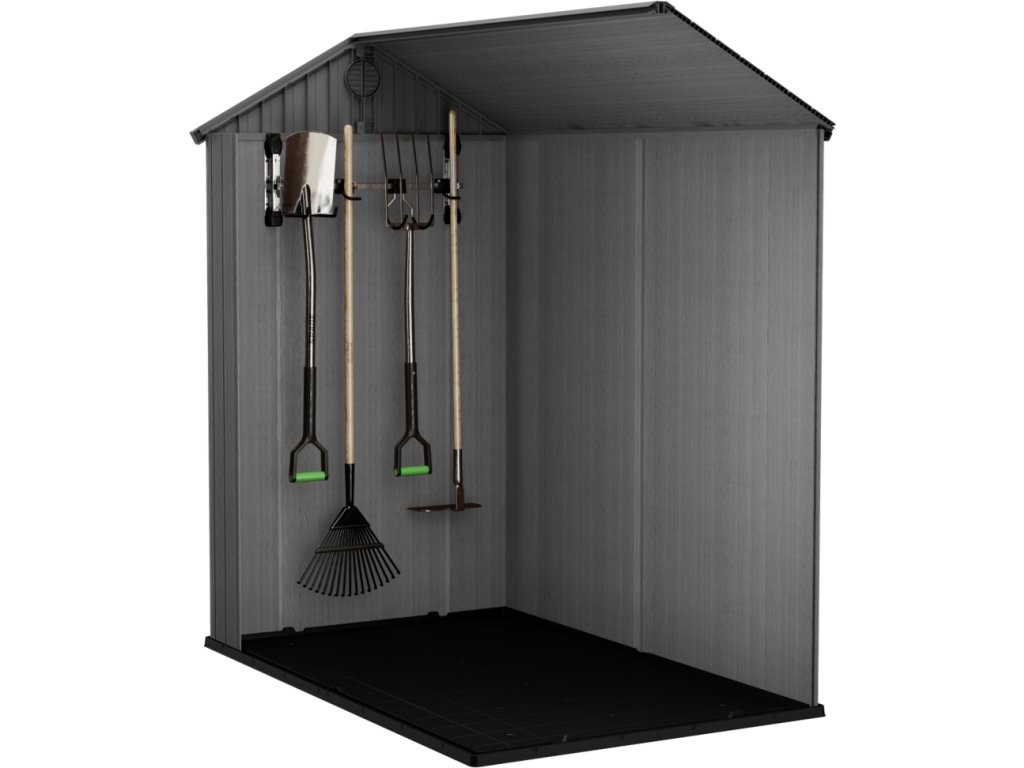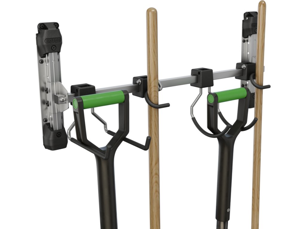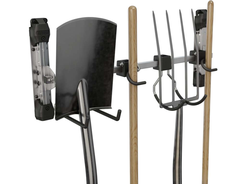 Držák je kompatibilní se všemi zahradními domky značky KETER (s výjimkou řady Factor) a s maximální nosností 36 kg je ideální pro zavěšení široké škály nástrojů – každý háček unese až 9 kg.