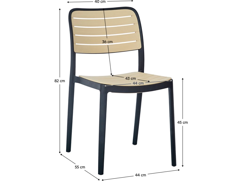 Materiál: plast Barva: černá/béžová Rozměry (ŠxHxV): 44x55x82 cm Výška sedu: 45 cm Hloubka sedu: 43 cm Šířka sedu: 44 cm Výška zad: 36 cm Šířka zad: 40 cm Nosnost: 100 kg Hmotnost: 4,8 kg Stohovatelná Vhodná do interiéru i exteriéru Dodáváno v monte