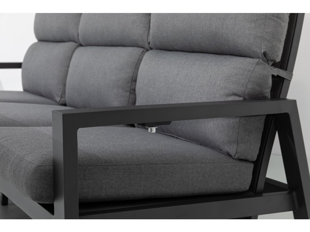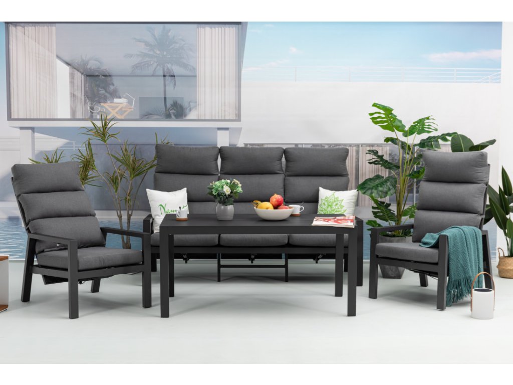 SANTINI – zahradní souprava Zahradní sestava SANTINI je multifunkčním řešení pro každého, kdo rád relaxuje na zahradě či terase. Další výhodou je praktická výška stolu 66 cm. U stolu se tedy pohodlně i najíte. Obě křesla mají možností polohování opěrek zad pomocí pístu. Nadýchané polstry mají antracitové potahy ze 100procent polyesteru, který je odolný, dobře odolává oděru či vlivům slunečního záření. Polstry jsou na zipy, potah je možné sejmout a vyprat. Samozřejmostí je bezúdržbová a stabilní hliníková konstrukce opatřená ochranným práškovým nástřikem v antracitové barvě, jejíž lehkost jistě oceníte vždy, když budete chtít sestavu přemístit. Informace o produktu: lehká a odolná hliníková konstrukce polohovací opěrky pomocí pístu včetně nadýchaného polstrování kvalitní potahy ze 100procent polyesteru snadná údržba, dlouhá životnost snímatelné potahy (možnost ručního praní) rozměry křeslo: 68 x 80 x 107 cm (šířka x hloubka x výška) rozměry pohovka: 185 x 80 x 107 cm (šířka x hloubka x výška) rozměry stolek: 140 x 75 x 66 cm (šířka x hloubka x výška) SANTINI set je možné kombinovat se SANTINI relaxačním setem.