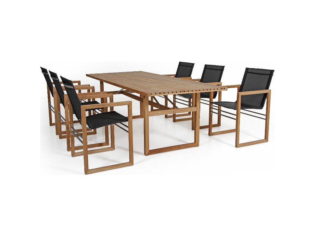 Jedálenská súprava z tropickej teakovej dreviny pre 6 až 8 osôb. Stoličky sú kombinované syntetickou textíliou v čiernej farbe. Záhradná súprava je odolná voči vplyvom počasia. Zloženie: súprava obsahuje 6x stolička, 1x stôlRozmery:stôl: 230 x 95 x 72 cm (Š/H/V)stolička: 56 x 58 x 88 cm (Š/H/V)Hmotnosť súpravy: 85 kg