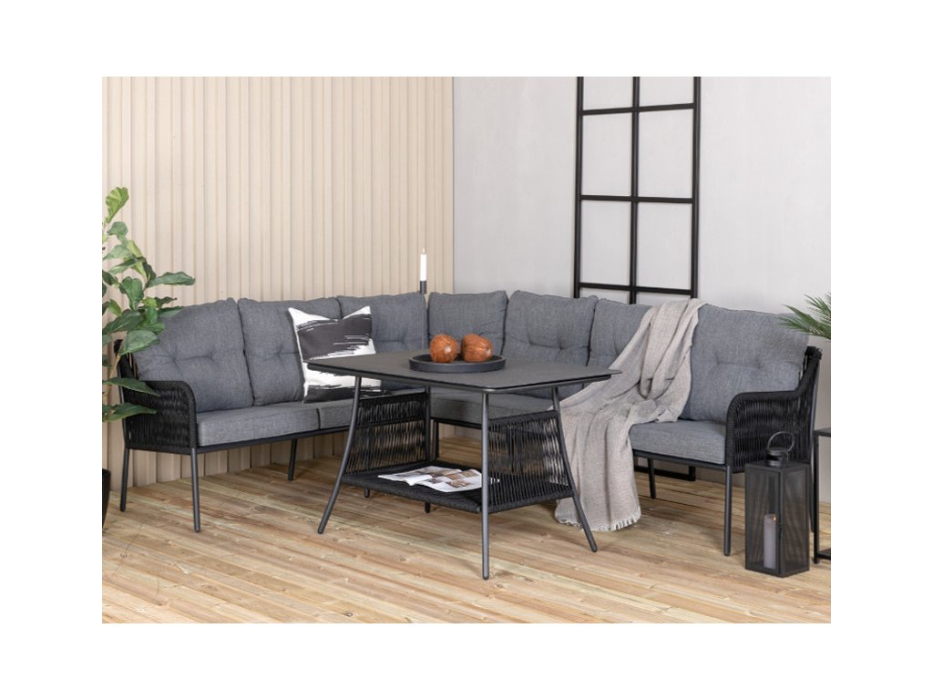 Vytvorte si toto leto na terase príjemnú oázu. Berlin rohová sedacia súprava je pohodlná a štýlová skupina nábytku z čiernej ocele a pleteného lana so sprievodným konferenčným stolíkom so štýlovou sklenenou doskou. Súčasťou sedačky sú odolné sivé vankúše. Sedačka pojme celkom 6 ľudí. Rozmery stola: 120x70x66 cm. Rozmery pohovky: 193/173 × 63,5 × 69,5 cm. Rozmery sedadla: 178 / 169x52x32 cm. Vyžaduje sa jednoduchšia montáž. Materiál: syntetické lano a oceľRozmery sedačky: 193 x 173 x 69,5 cm Š/H/VRozmery stola: 120 x 70 x 66 cmVýška sedu: Farba: čierno šedá