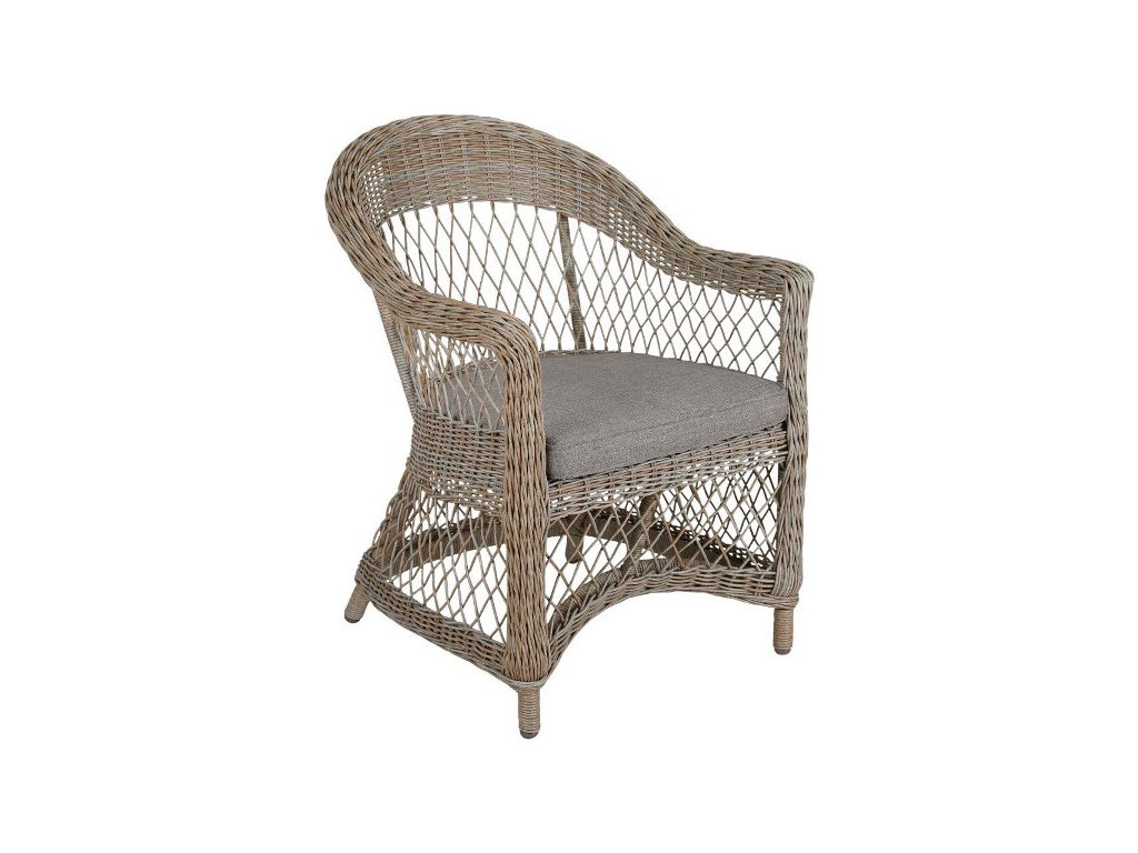 Séria nábytku Kamomill v klasickom romantickom dizajne s otvoreným výpletom z umelého ratanu. Umelý ratan v prírodnej farbe s otvorenou väzbou a béžovým sedákom z olefínovej látky.Materiál: umelý ratanUV odolnosť: ÁNOKonštrukcia: hliníkováRozmery: 64 x 68 x 86 cm Š/H/VHmotnosť: 8 kg