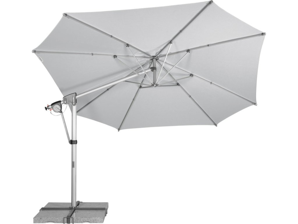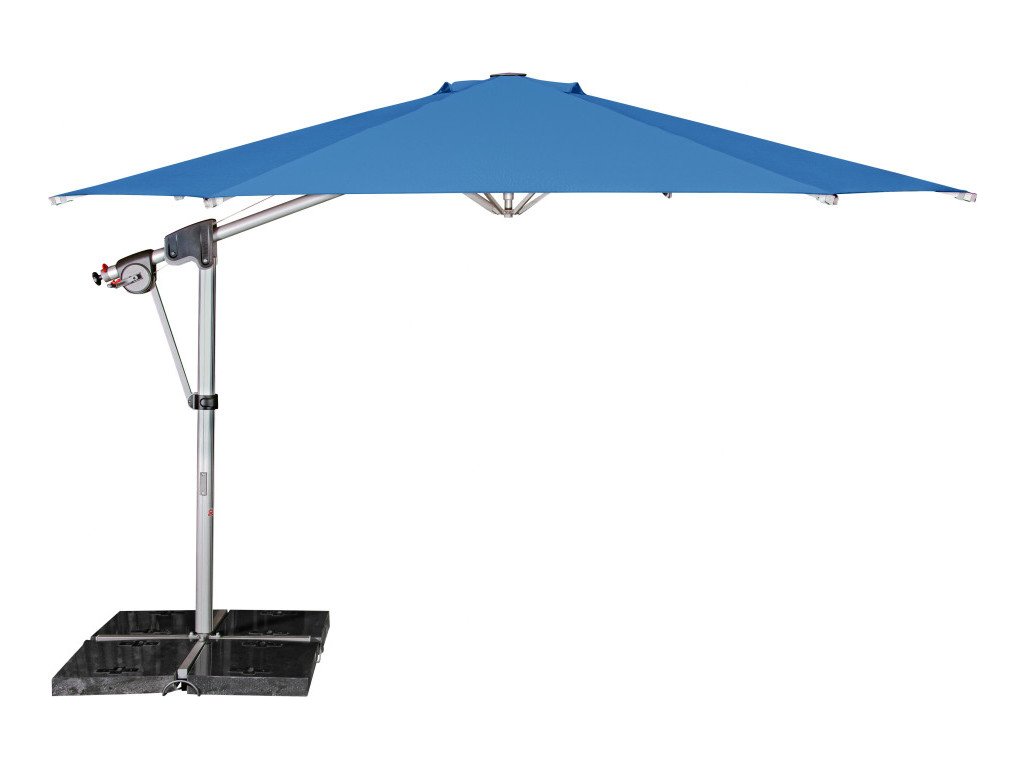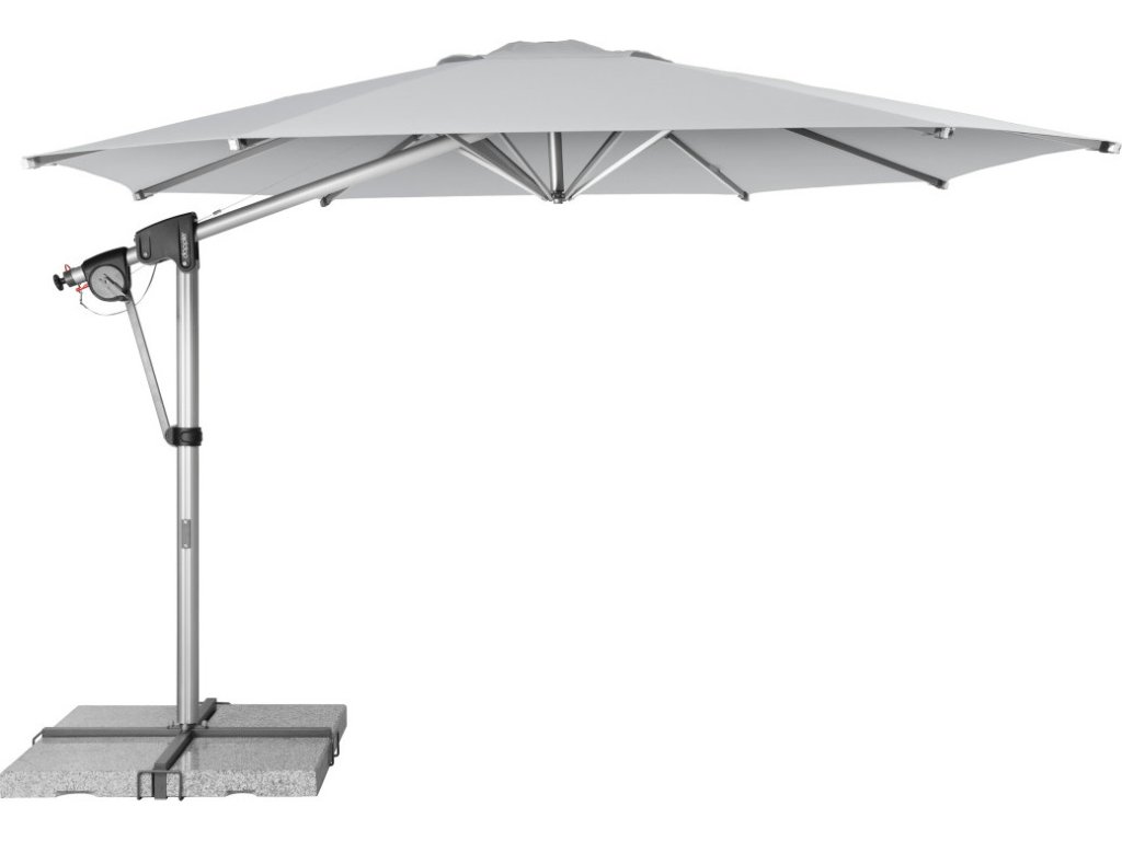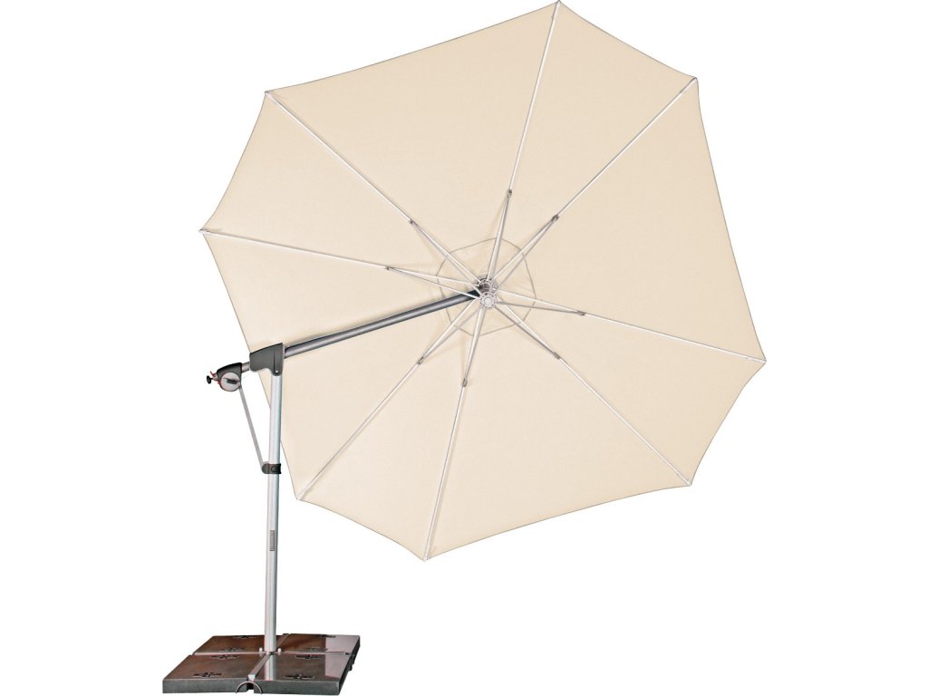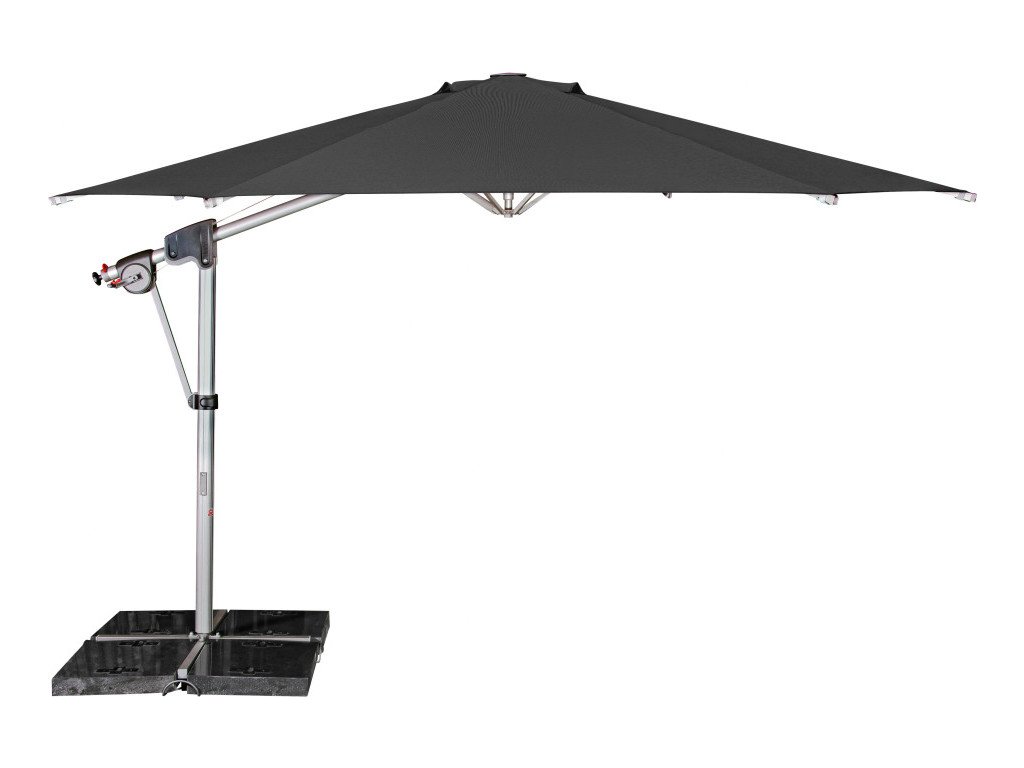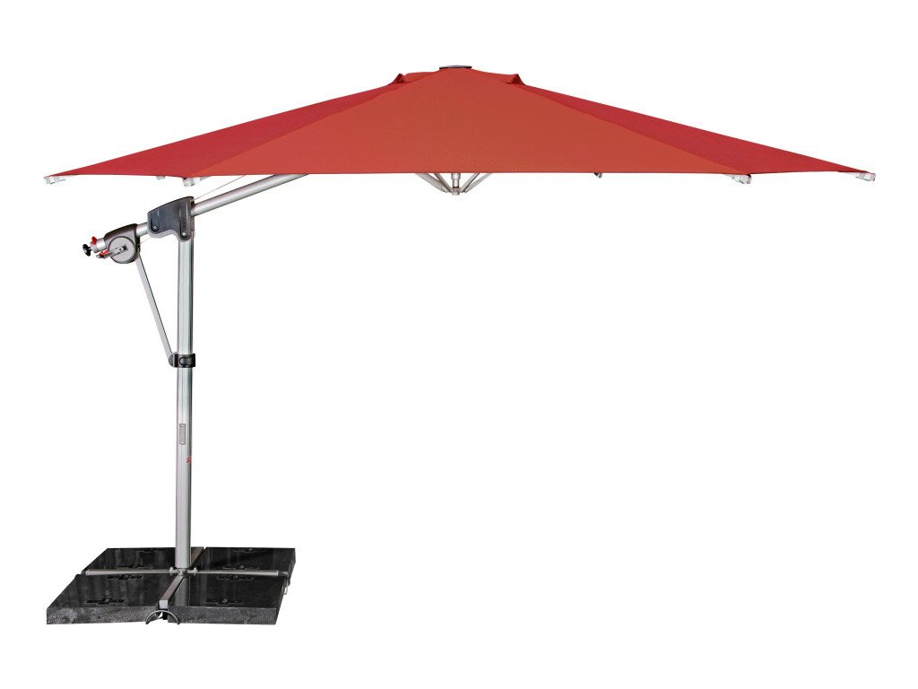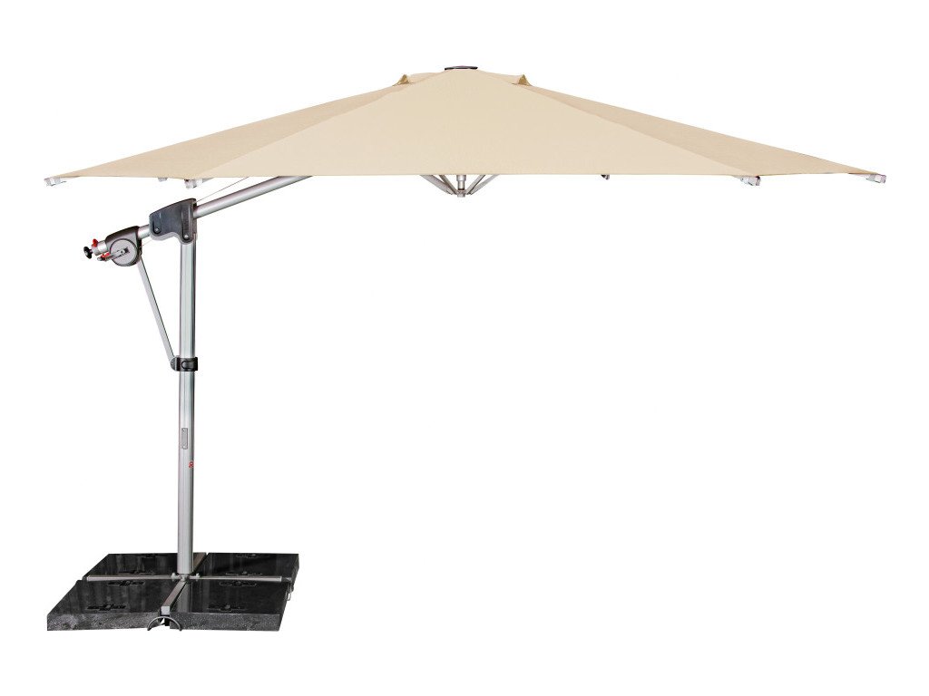 Vlastnosti a funkce: Impregnace proti skvrnám a špíně, Naklápěcí, Snímatelný/ručně pratelný potah slunečníku, Odolný povětrnostním vlivům, Automatické otevírání klikou, Otočný kolem osy