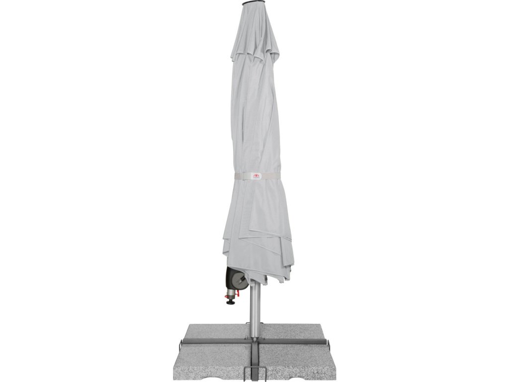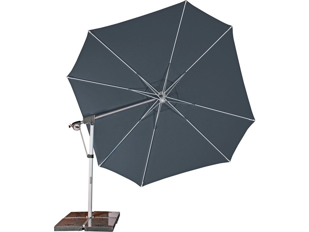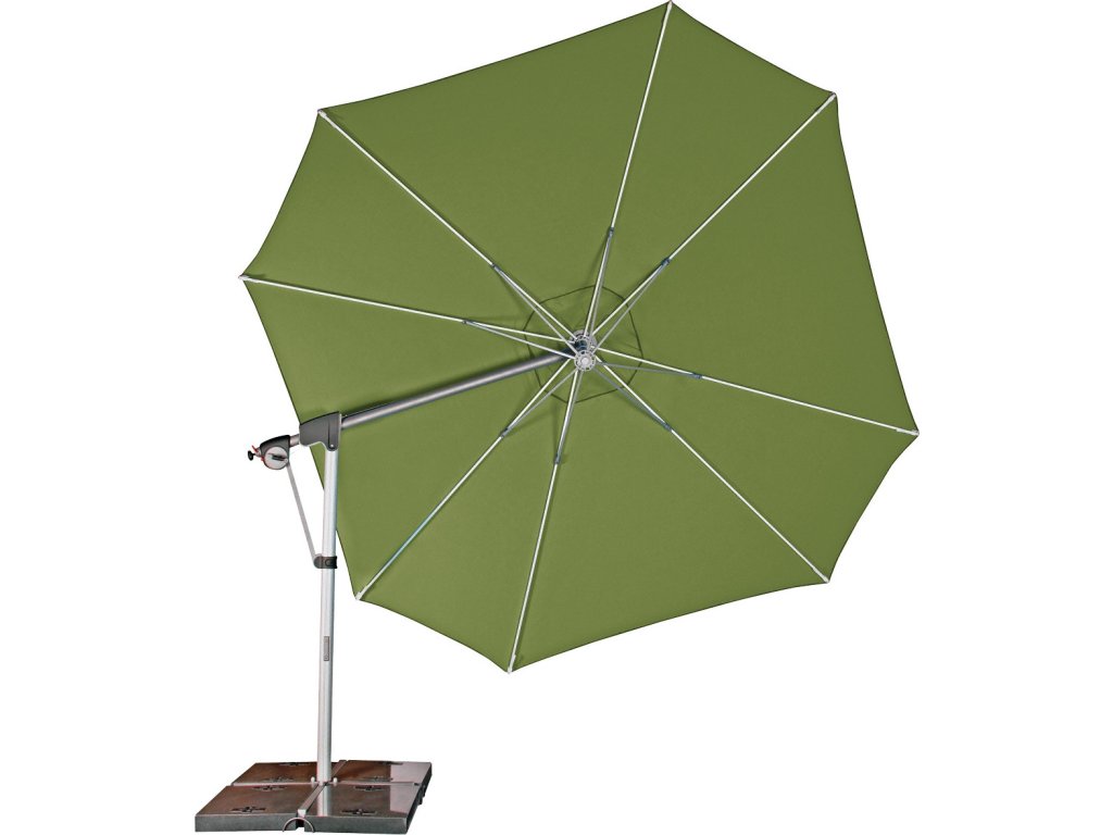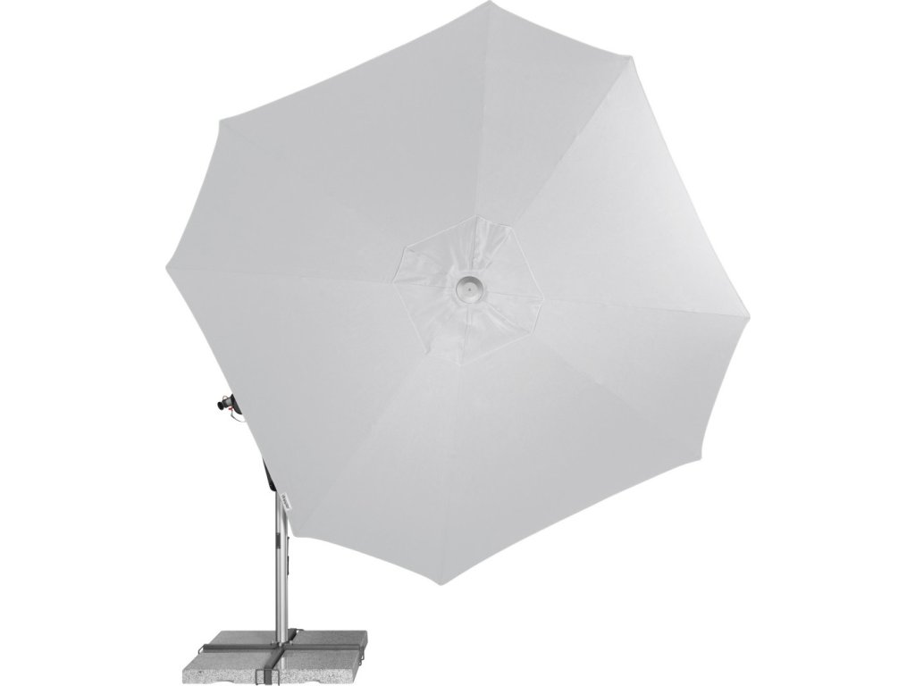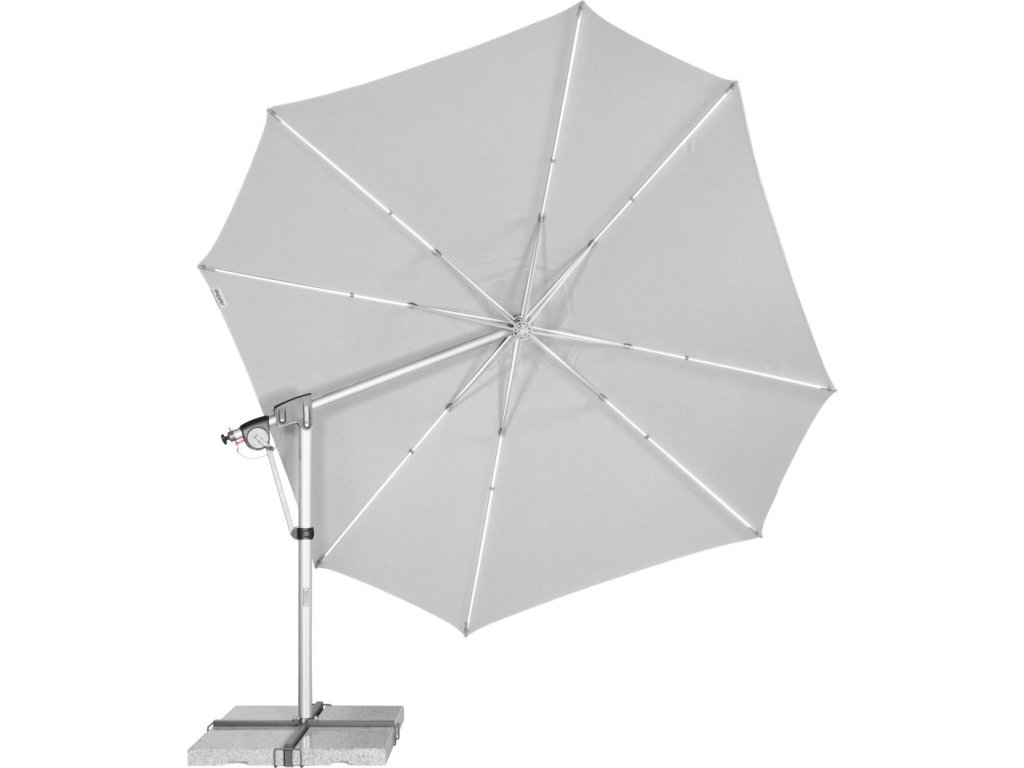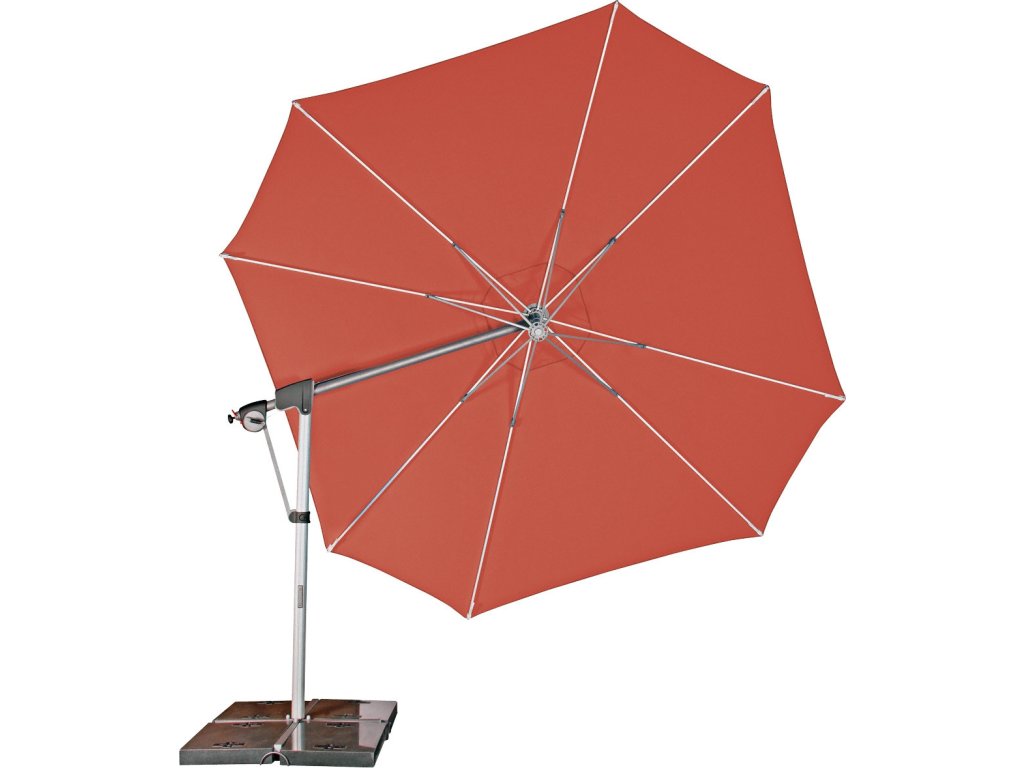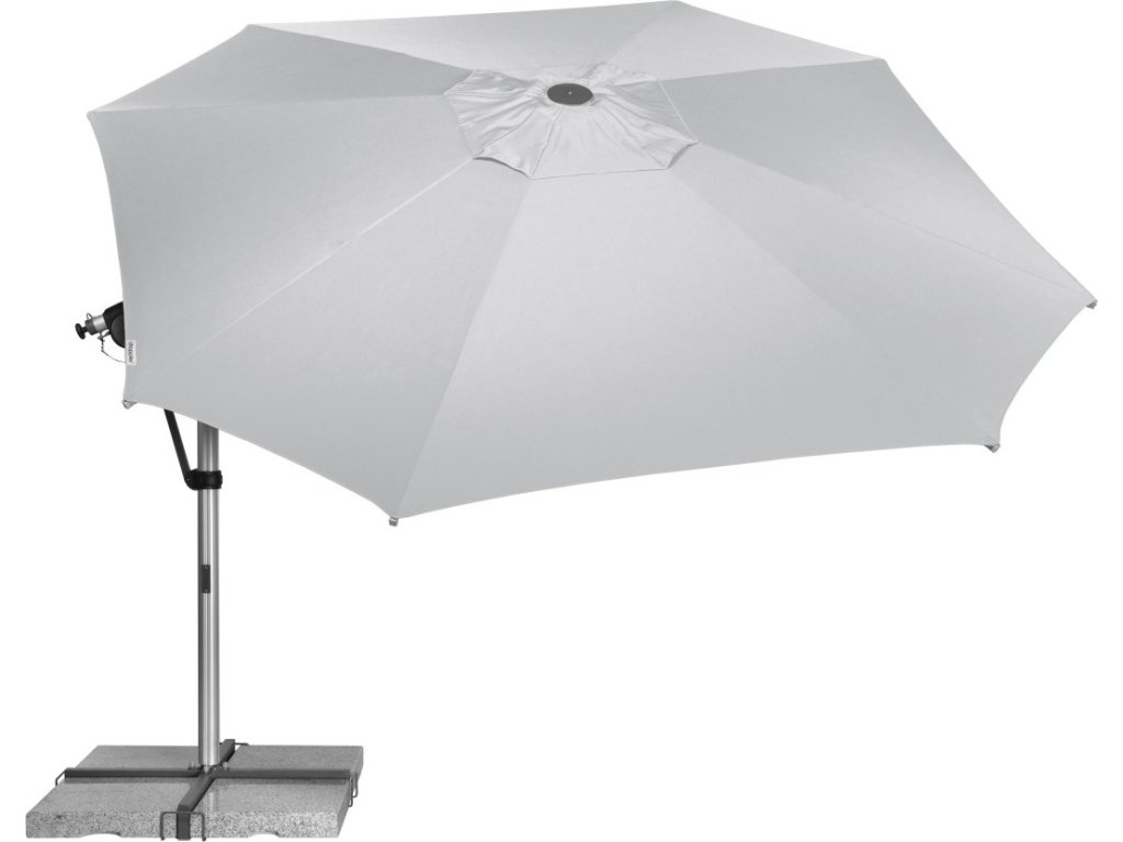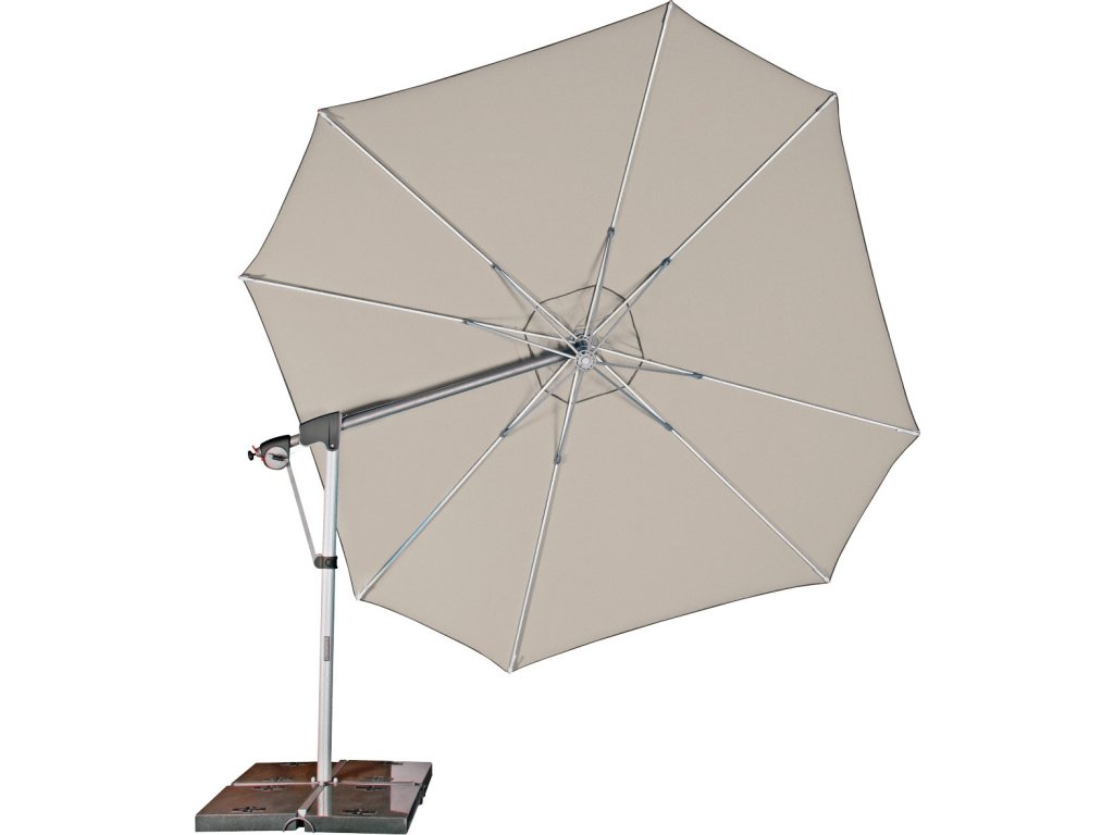Vlastnosti a funkce: Impregnace proti skvrnám a špíně, Naklápěcí, Snímatelný/ručně pratelný potah slunečníku, Odolný povětrnostním vlivům, Automatické otevírání klikou, Otočný kolem osy